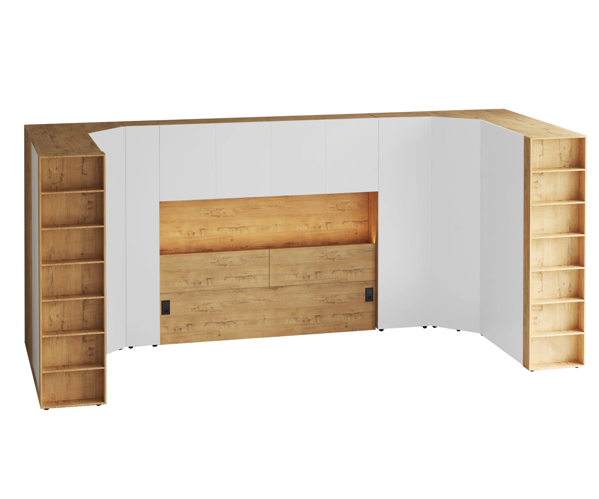 Кроватный блок предназначен для использования совместно с кроватью или диваном. Блок имеет два отделения за откидными дверьми и открытую полку над ними. Двери открываются за кромку, с помощью газовых кронштейнов. Кроватный блок оснащен светодиодным светильником, расположенным на открытой верхней полке. Светильник представляет собой алюминиевый профиль с матовым экраном, внутри которого установлена светодиодная лента. С левой и с правой стороны переднего щита блока установлены выключатели светильника и эл. розетки с разъемами USB А и Type C. Блок установлен на регулируемые опоры.