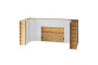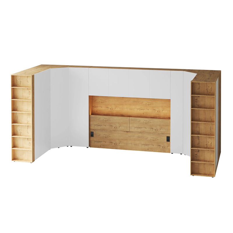 Кроватный блок предназначен для использования совместно с кроватью или диваном. Блок имеет два отделения за откидными дверьми и открытую полку над ними. Двери открываются за кромку, с помощью газовых кронштейнов. Кроватный блок оснащен светодиодным светильником, расположенным на открытой верхней полке. Светильник представляет собой алюминиевый профиль с матовым экраном, внутри которого установлена светодиодная лента. С левой и с правой стороны переднего щита блока установлены выключатели светильника и эл. розетки с разъемами USB А и Type C. Блок установлен на регулируемые опоры.