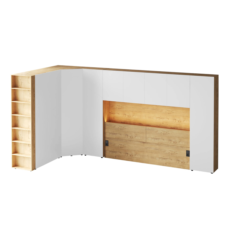 Кроватный блок предназначен для использования совместно с кроватью или диваном. Блок имеет два отделения за откидными дверьми и открытую полку над ними. Двери открываются за кромку, с помощью газовых кронштейнов. Кроватный блок оснащен светодиодным светильником, расположенным на открытой верхней полке. Светильник представляет собой алюминиевый профиль с матовым экраном, внутри которого установлена светодиодная лента. С левой и с правой стороны переднего щита блока установлены выключатели светильника и эл. розетки с разъемами USB А и Type C. Блок установлен на регулируемые опоры.