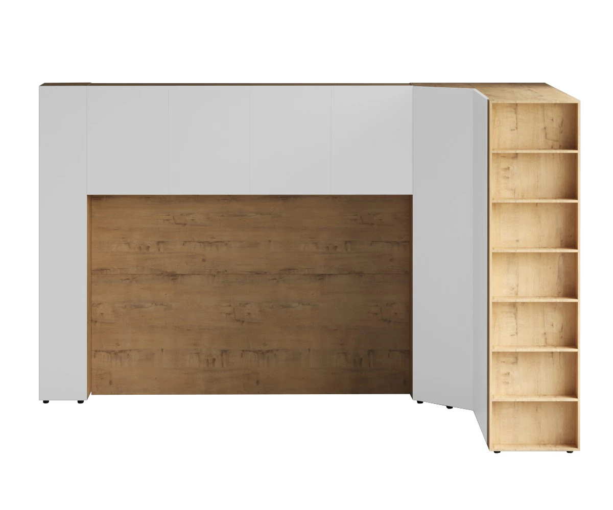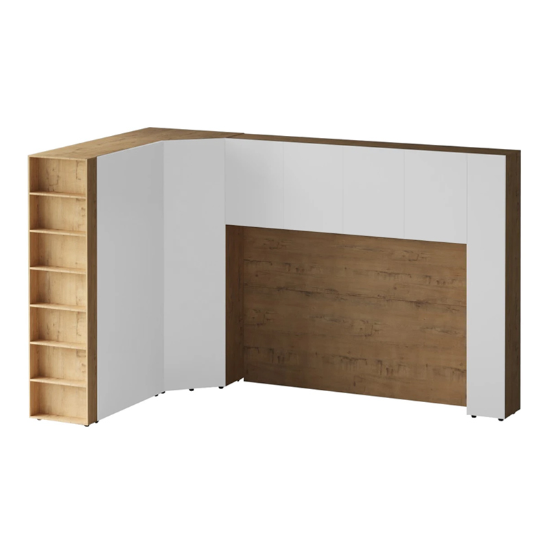 Кроватный блок предназначен для использования совместно с кроватью или диваном. Блок имеет два отделения за откидными дверьми и открытую полку над ними. Двери открываются за кромку, с помощью газовых кронштейнов. Кроватный блок оснащен светодиодным светильником, расположенным на открытой верхней полке. Светильник представляет собой алюминиевый профиль с матовым экраном, внутри которого установлена светодиодная лента. С левой и с правой стороны переднего щита блока установлены выключатели светильника и эл. розетки с разъемами USB А и Type C. Блок установлен на регулируемые опоры.