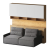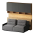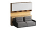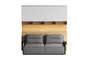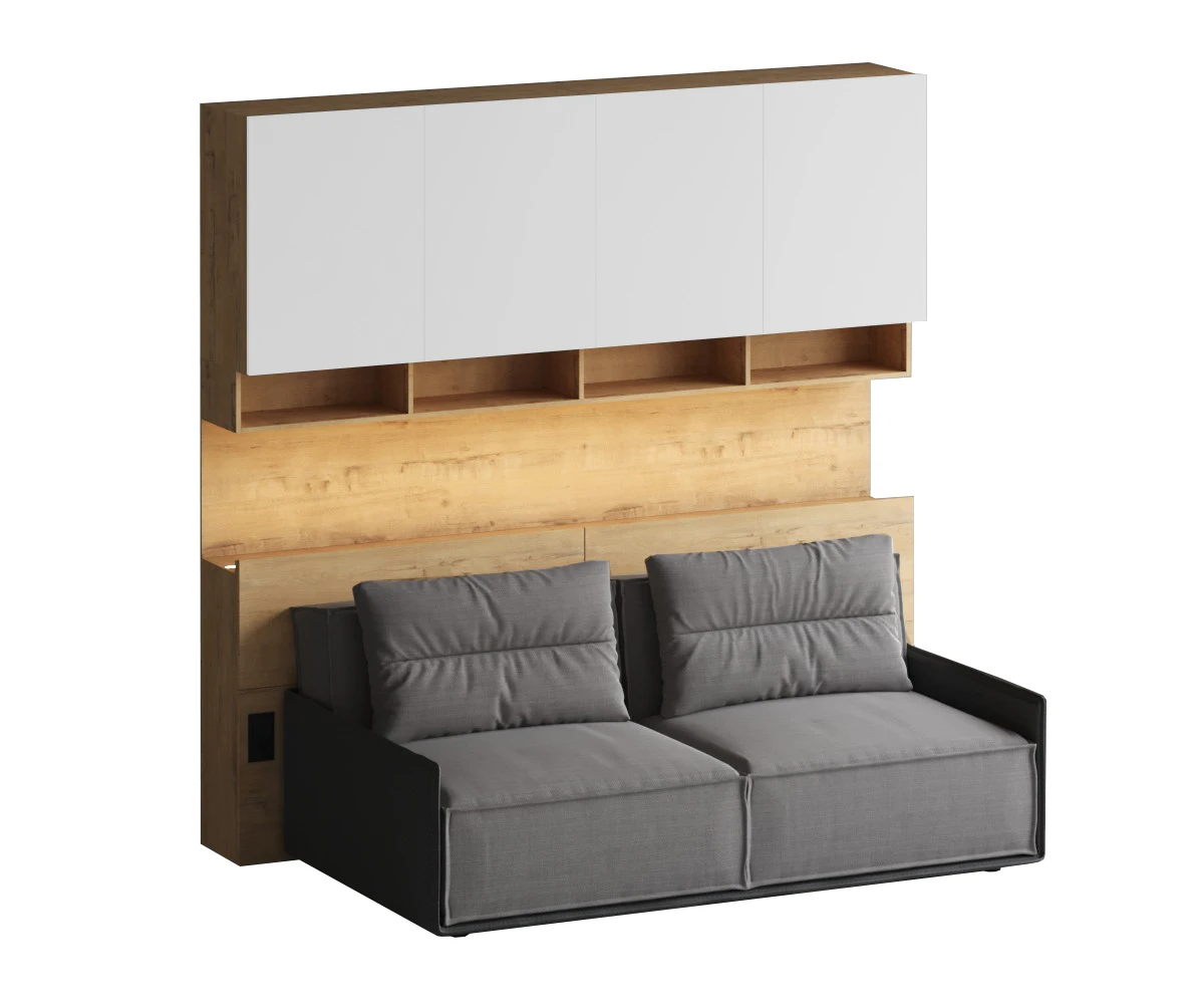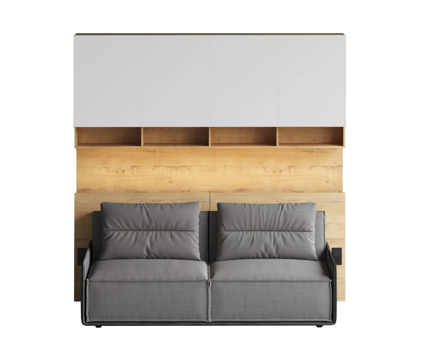 Кроватный блок предназначен для использования совместно с кроватью или диваном. Блок имеет два отделения за откидными дверьми и открытую полку над ними. Двери открываются за кромку, с помощью газовых кронштейнов. Кроватный блок оснащен светодиодным светильником, расположенным на открытой верхней полке. Светильник представляет собой алюминиевый профиль с матовым экраном, внутри которого установлена светодиодная лента. С левой и с правой стороны переднего щита блока установлены выключатели светильника и эл. розетки с разъемами USB А и Type C. Блок установлен на регулируемые опоры.