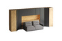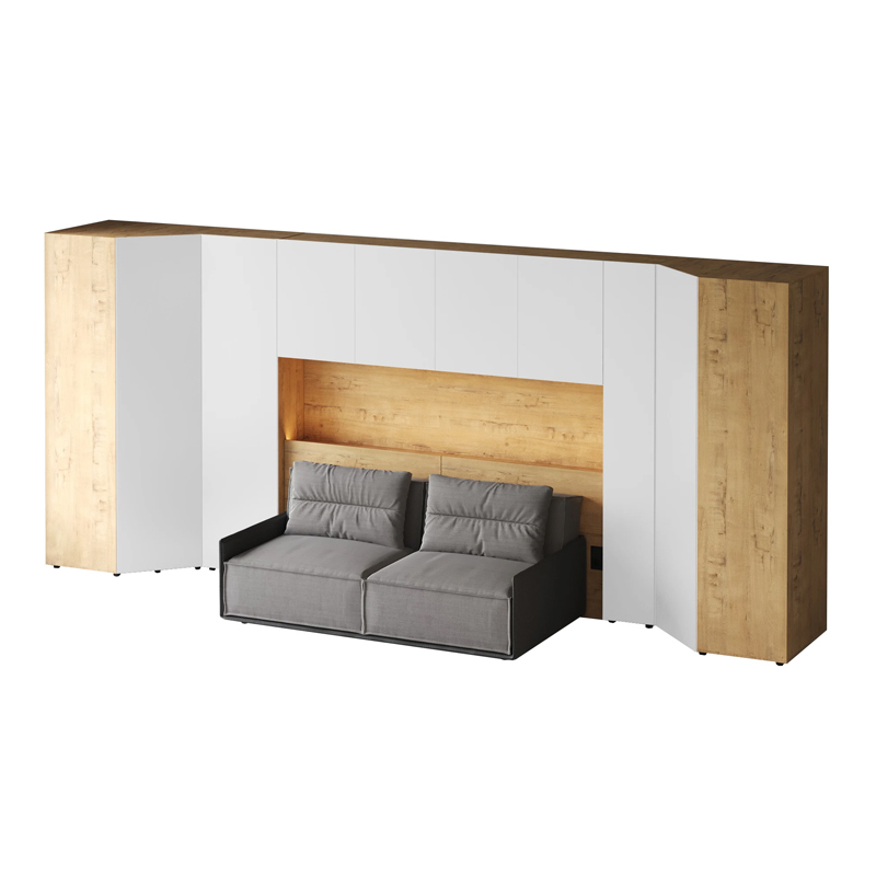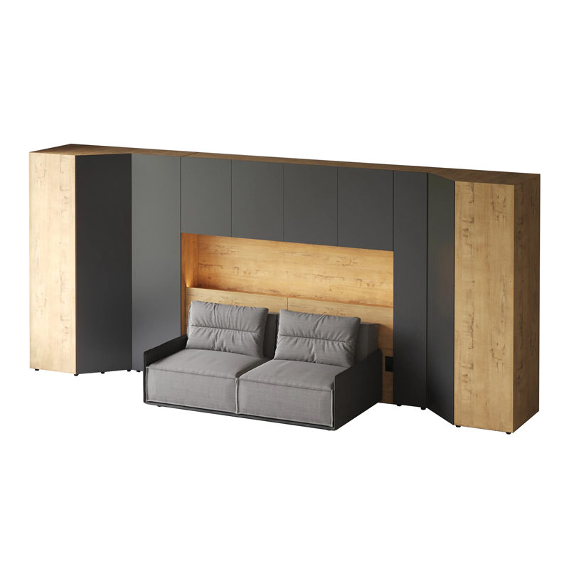 Кроватный блок предназначен для использования совместно с кроватью или диваном. Блок имеет два отделения за откидными дверьми и открытую полку над ними. Двери открываются за кромку, с помощью газовых кронштейнов. Кроватный блок оснащен светодиодным светильником, расположенным на открытой верхней полке. Светильник представляет собой алюминиевый профиль с матовым экраном, внутри которого установлена светодиодная лента. С левой и с правой стороны переднего щита блока установлены выключатели светильника и эл. розетки с разъемами USB А и Type C. Блок установлен на регулируемые опоры.