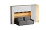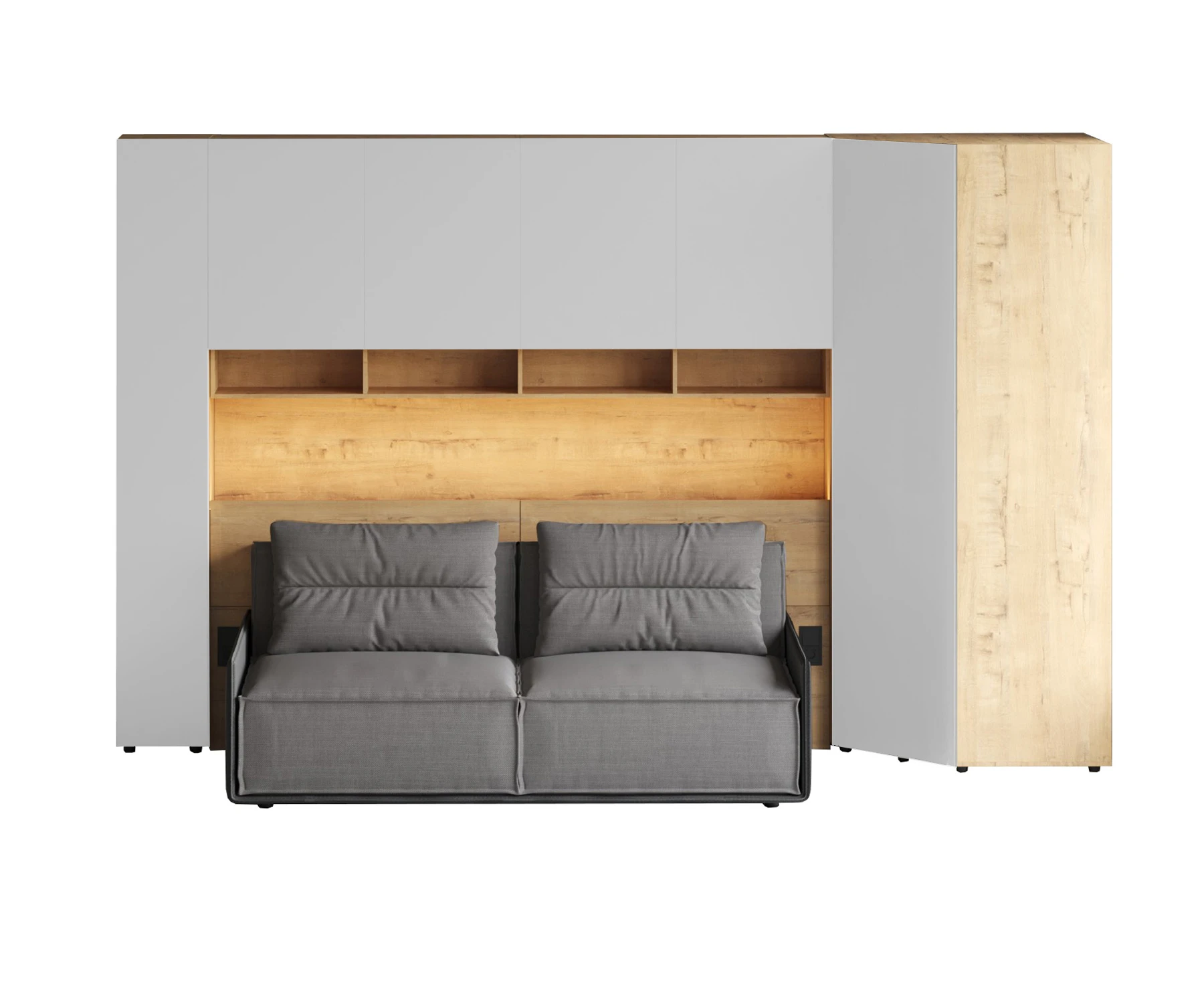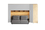 Кроватный блок предназначен для использования совместно с кроватью или диваном. Блок имеет два отделения за откидными дверьми и открытую полку над ними. Двери открываются за кромку, с помощью газовых кронштейнов. Кроватный блок оснащен светодиодным светильником, расположенным на открытой верхней полке. Светильник представляет собой алюминиевый профиль с матовым экраном, внутри которого установлена светодиодная лента. С левой и с правой стороны переднего щита блока установлены выключатели светильника и эл. розетки с разъемами USB А и Type C. Блок установлен на регулируемые опоры.