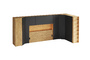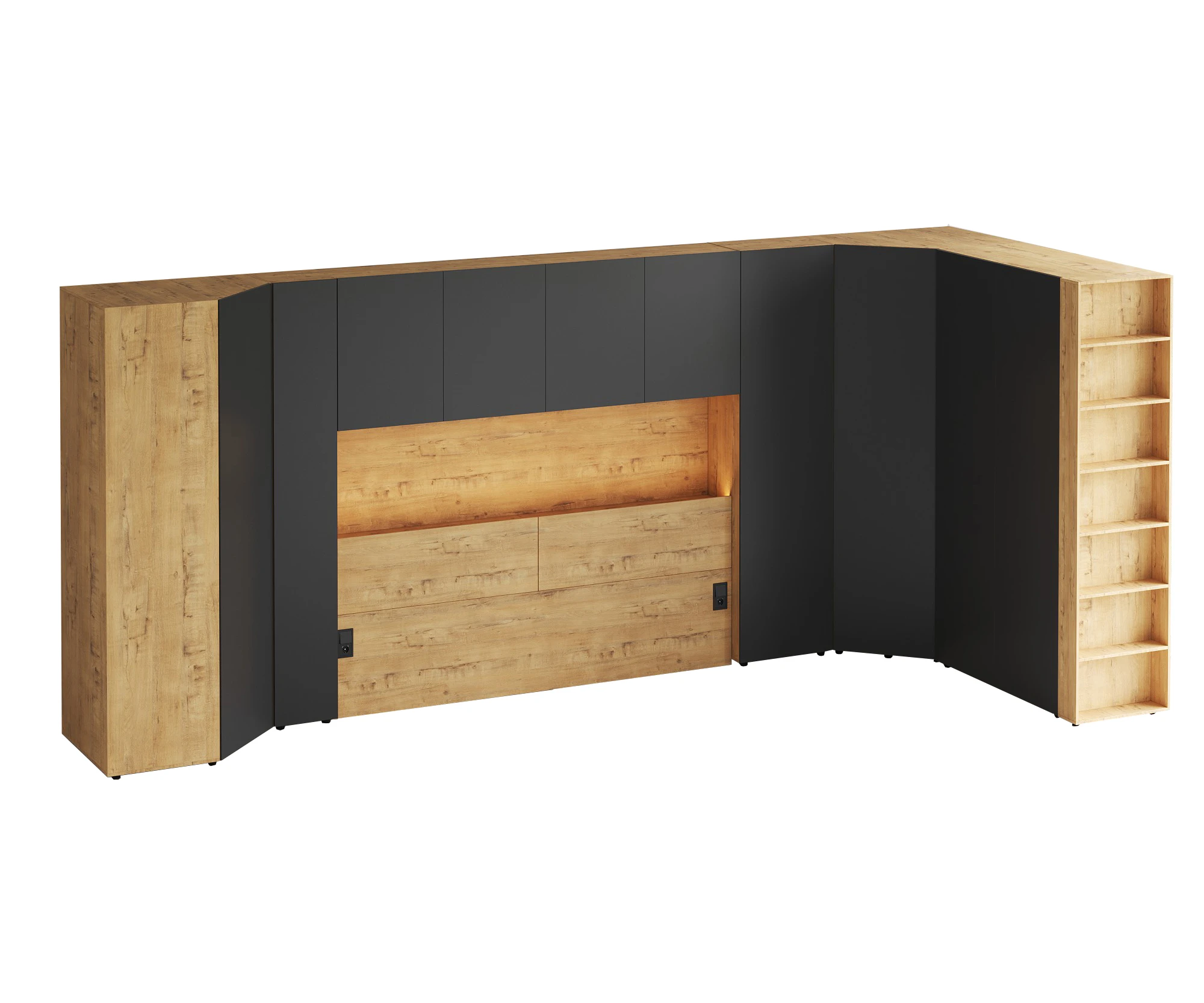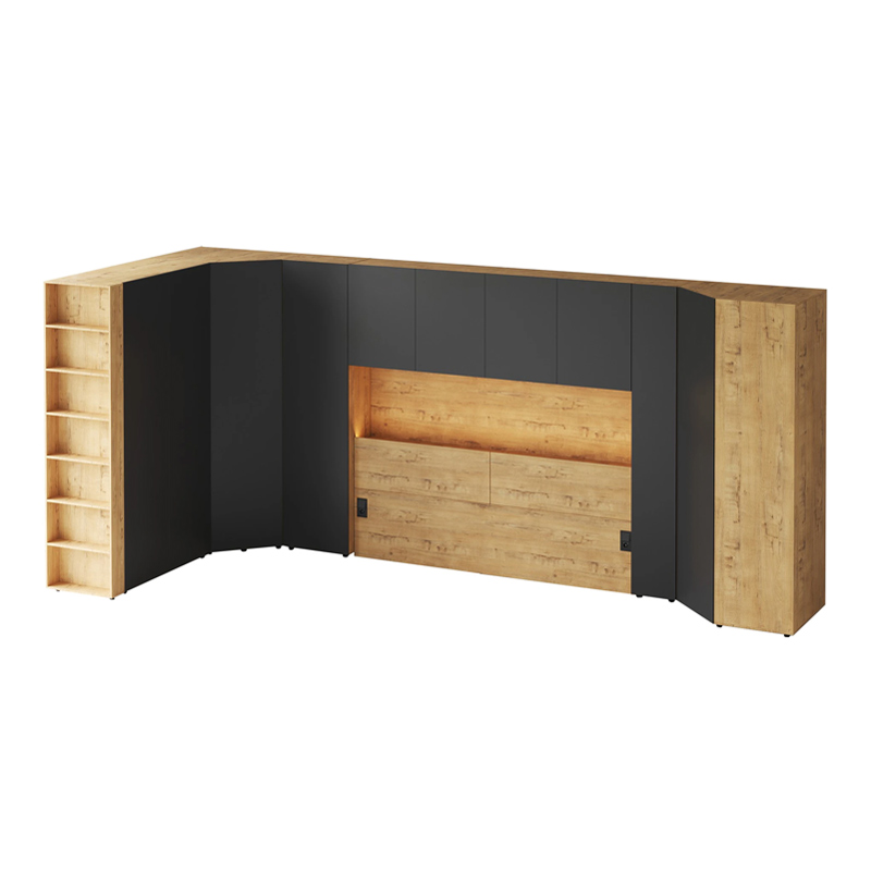 Кроватный блок предназначен для использования совместно с кроватью или диваном. Блок имеет два отделения за откидными дверьми и открытую полку над ними. Двери открываются за кромку, с помощью газовых кронштейнов. Кроватный блок оснащен светодиодным светильником, расположенным на открытой верхней полке. Светильник представляет собой алюминиевый профиль с матовым экраном, внутри которого установлена светодиодная лента. С левой и с правой стороны переднего щита блока установлены выключатели светильника и эл. розетки с разъемами USB А и Type C. Блок установлен на регулируемые опоры.
