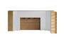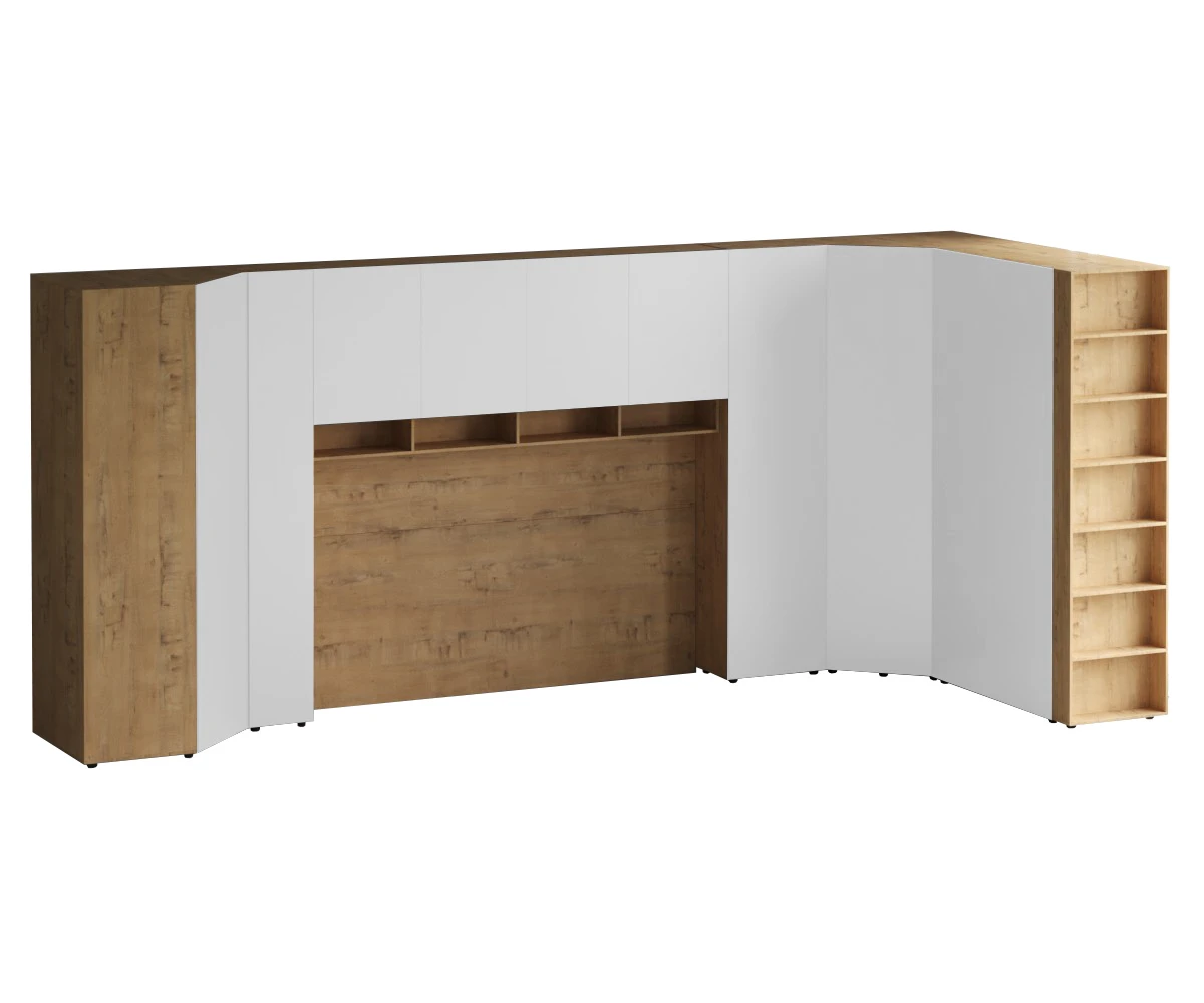 Кроватный блок предназначен для использования совместно с кроватью или диваном. Блок имеет два отделения за откидными дверьми и открытую полку над ними. Двери открываются за кромку, с помощью газовых кронштейнов. Кроватный блок оснащен светодиодным светильником, расположенным на открытой верхней полке. Светильник представляет собой алюминиевый профиль с матовым экраном, внутри которого установлена светодиодная лента. С левой и с правой стороны переднего щита блока установлены выключатели светильника и эл. розетки с разъемами USB А и Type C. Блок установлен на регулируемые опоры.