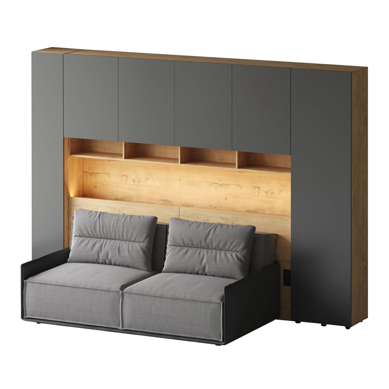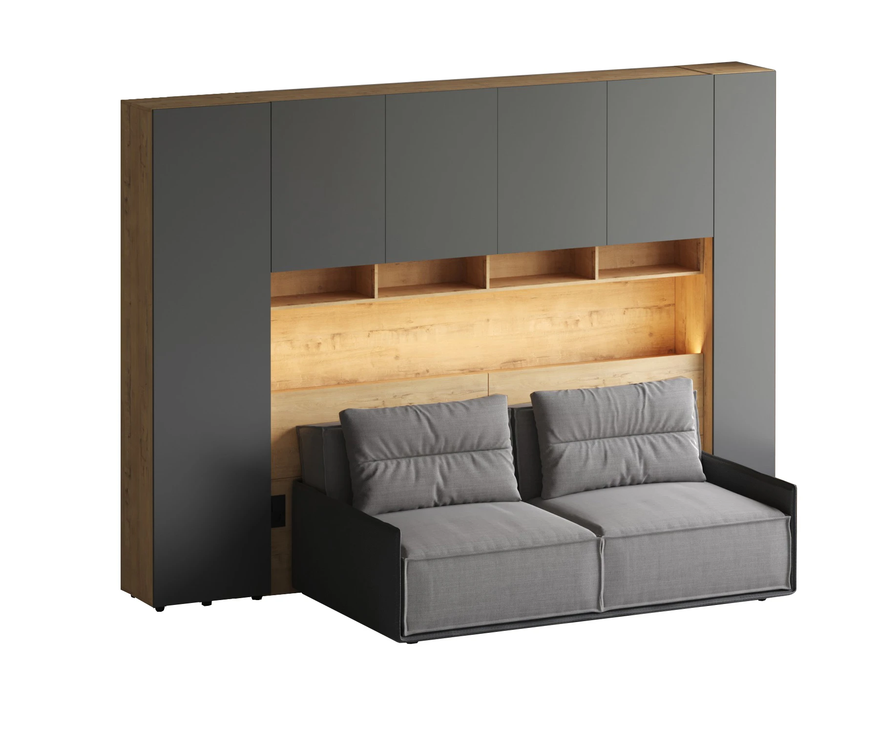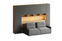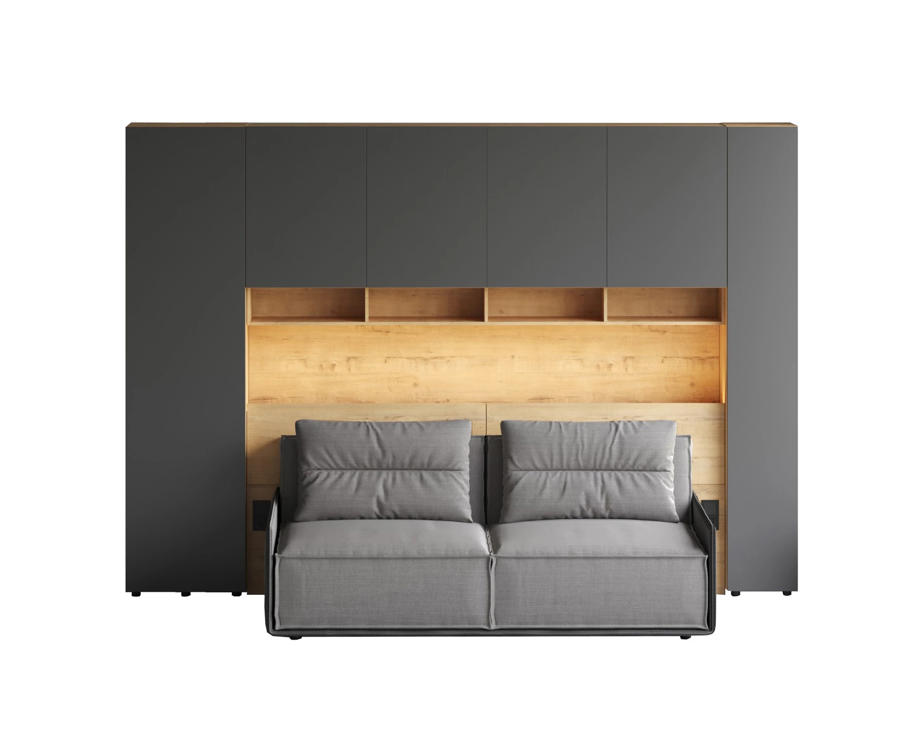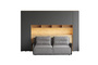 Кроватный блок предназначен для использования совместно с кроватью или диваном. Блок имеет два отделения за откидными дверьми и открытую полку над ними. Двери открываются за кромку, с помощью газовых кронштейнов. Кроватный блок оснащен светодиодным светильником, расположенным на открытой верхней полке. Светильник представляет собой алюминиевый профиль с матовым экраном, внутри которого установлена светодиодная лента. С левой и с правой стороны переднего щита блока установлены выключатели светильника и эл. розетки с разъемами USB А и Type C. Блок установлен на регулируемые опоры.