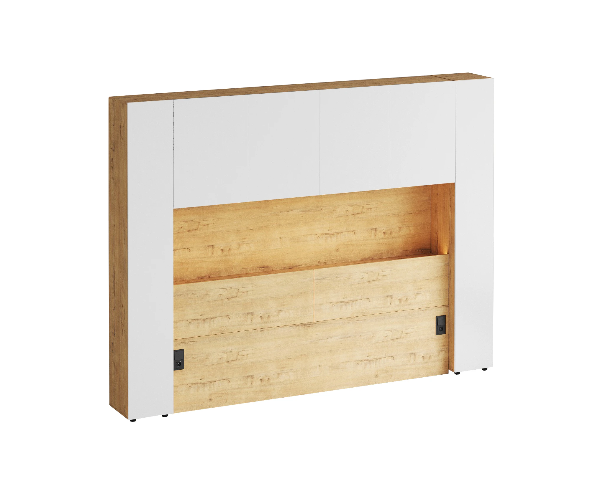 Кроватный блок предназначен для использования совместно с кроватью или диваном. Блок имеет два отделения за откидными дверьми и открытую полку над ними. Двери открываются за кромку, с помощью газовых кронштейнов. Кроватный блок оснащен светодиодным светильником, расположенным на открытой верхней полке. Светильник представляет собой алюминиевый профиль с матовым экраном, внутри которого установлена светодиодная лента. С левой и с правой стороны переднего щита блока установлены выключатели светильника и эл. розетки с разъемами USB А и Type C. Блок установлен на регулируемые опоры.