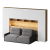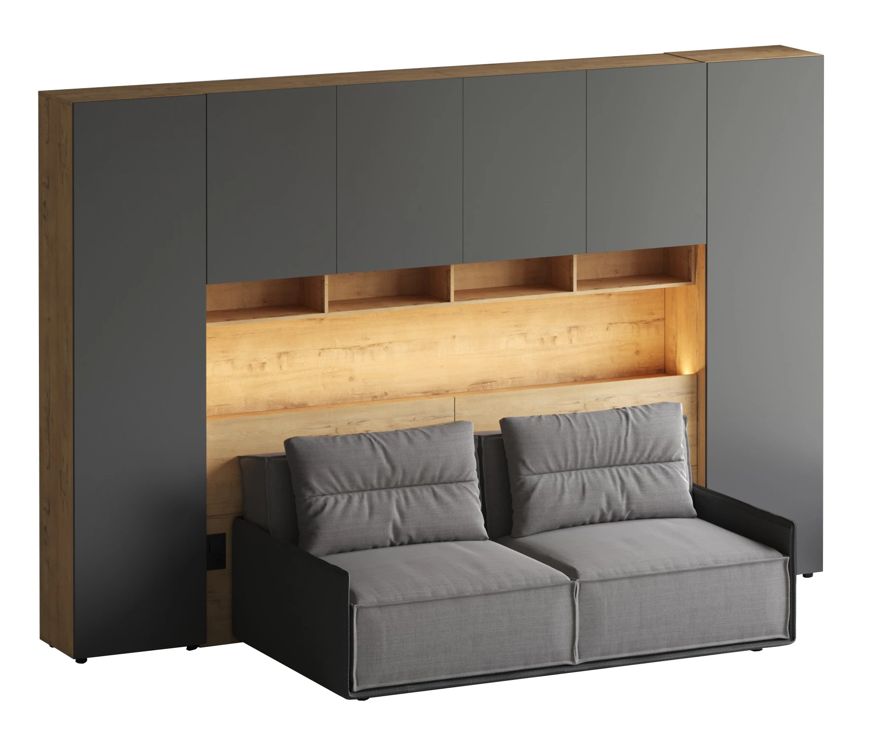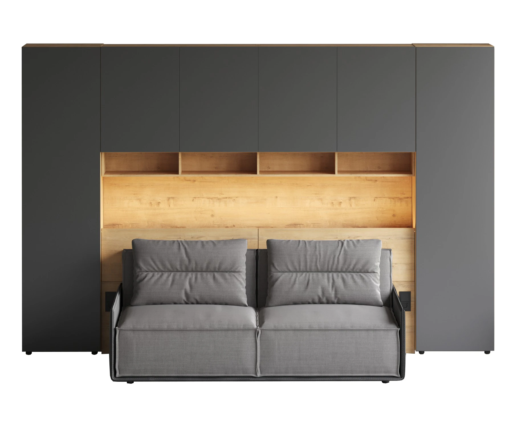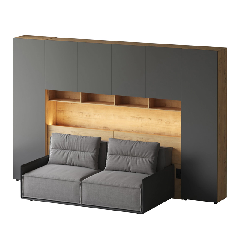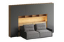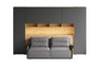Кроватный блок предназначен для использования совместно с кроватью или диваном. Блок имеет два отделения за откидными дверьми и открытую полку над ними. Двери открываются за кромку, с помощью газовых кронштейнов. Кроватный блок оснащен светодиодным светильником, расположенным на открытой верхней полке. Светильник представляет собой алюминиевый профиль с матовым экраном, внутри которого установлена светодиодная лента. С левой и с правой стороны переднего щита блока установлены выключатели светильника и эл. розетки с разъемами USB А и Type C. Блок установлен на регулируемые опоры.