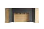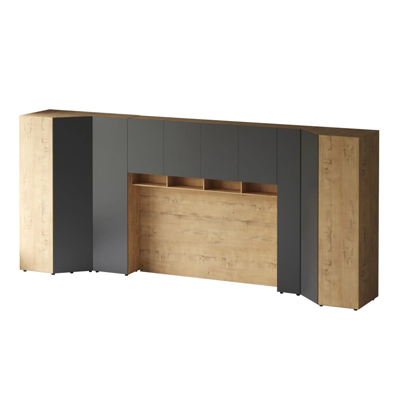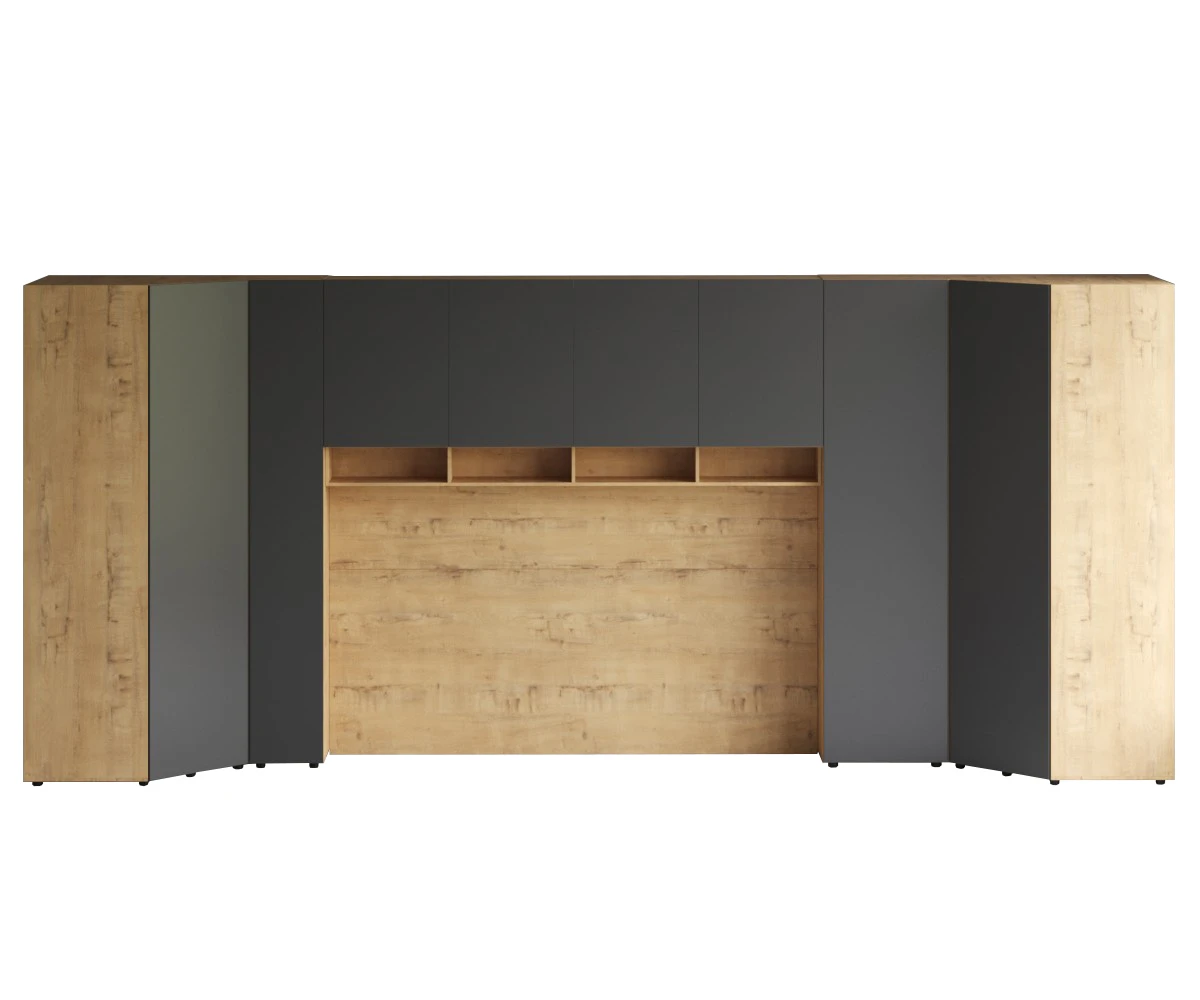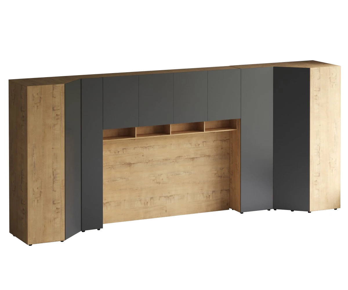 Кроватный блок предназначен для использования совместно с кроватью или диваном. Блок имеет два отделения за откидными дверьми и открытую полку над ними. Двери открываются за кромку, с помощью газовых кронштейнов. Кроватный блок оснащен светодиодным светильником, расположенным на открытой верхней полке. Светильник представляет собой алюминиевый профиль с матовым экраном, внутри которого установлена светодиодная лента. С левой и с правой стороны переднего щита блока установлены выключатели светильника и эл. розетки с разъемами USB А и Type C. Блок установлен на регулируемые опоры.