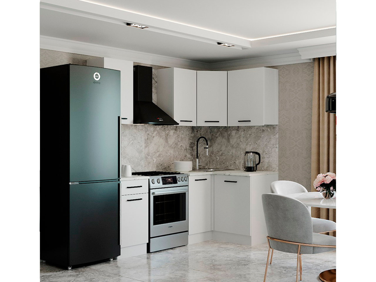 • На все модули мы устанавливаем Петли с доводчиком, работают от 5°, система быстрого монтажа Clip on и шариковые направляющие ящиков. Данная фурнитура позволяет не только долго и с
