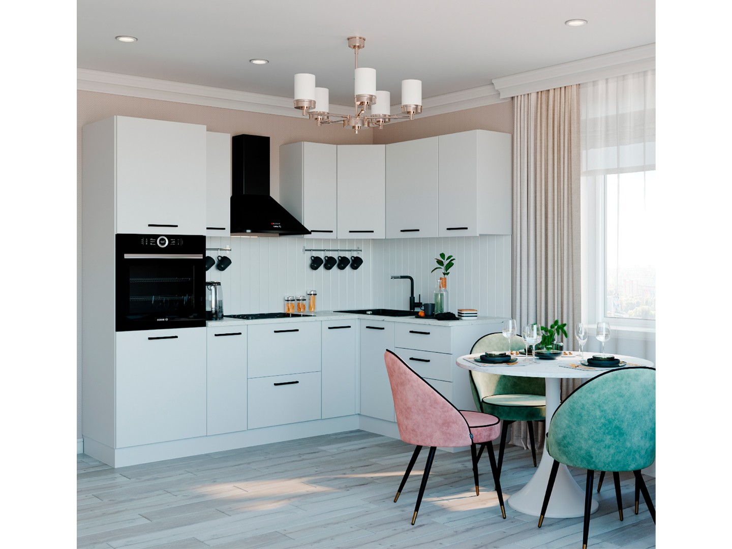 • На все модули мы устанавливаем Петли с доводчиком, работают от 5°, система быстрого монтажа Clip on и шариковые направляющие ящиков. Данная фурнитура позволяет не только долго и с