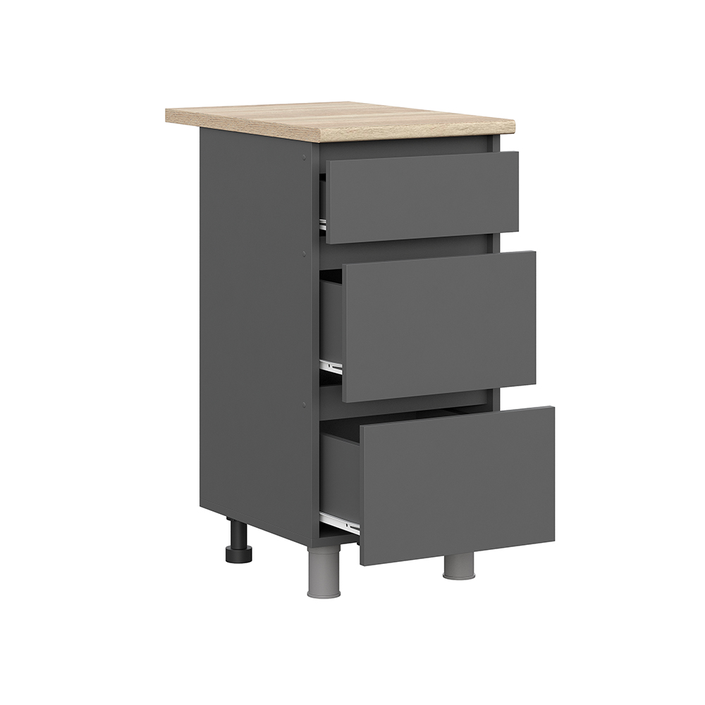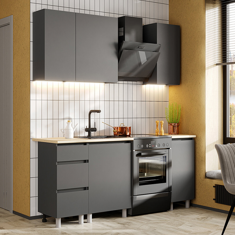 Запросить индивидуальное предложениеКухонный гарнитур Денвер - это практичное решение для организации кухонной зоны в малогабаритной квартире или квартире-студии. Состоит из 6-ти удобных модулей. Два верхних шкафа шириной 40 см и один шкаф шириной 60 см оснащены распашными фасадами, за дверцами шкафов скрываются полки. Нижний ряд состоит из двух рабочих столов с полками шириной 40 и 60 см и стола шириной 40 см с тремя выкатными ящиками. При сборке шкаф нижний с полкой используется как шкаф под мойку.
