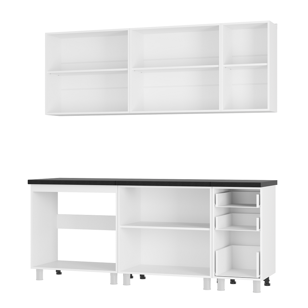 Функциональность: кухня оснащена выдвижными ящиками, полками и шкафами для хранения посуды, продуктов и кухонных принадлежностей.