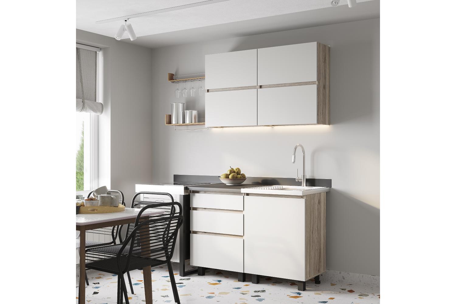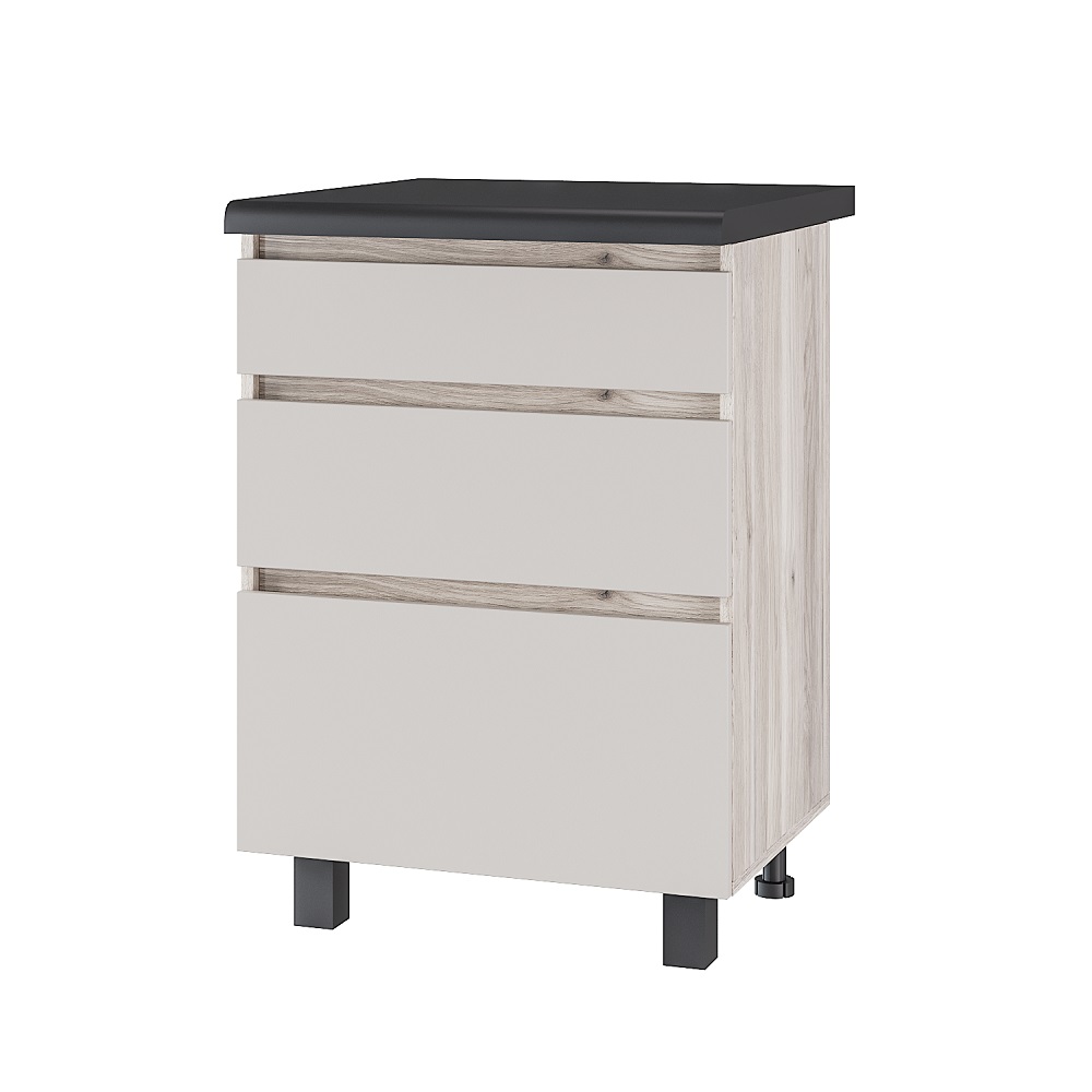 Шкаф со столешницей Берген Лайт 6с3 - это элегантный и практичный элемент мебели, который станет идеальным дополнением для Вашей кухни. Она оснащена 3-мя выдвижными ящиками с роликовыми направляющими для хранения кухонной утвари, посуды и прочих необходимых мелочей. Особенности: - Интегрированные ручки - Направляющие ящики: Роликовые - Материал: ЛДСП - Максимальная нагрузка на ящик - 5 кг. Столешница 26 мм в чёрном цвете идёт в комплекте.