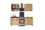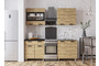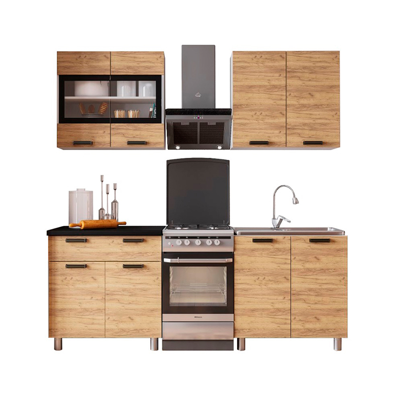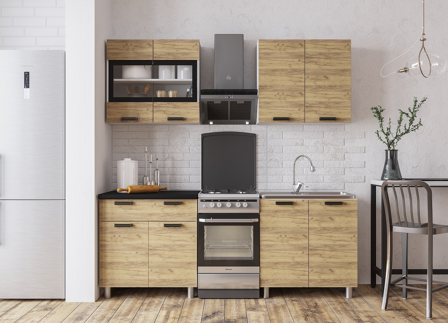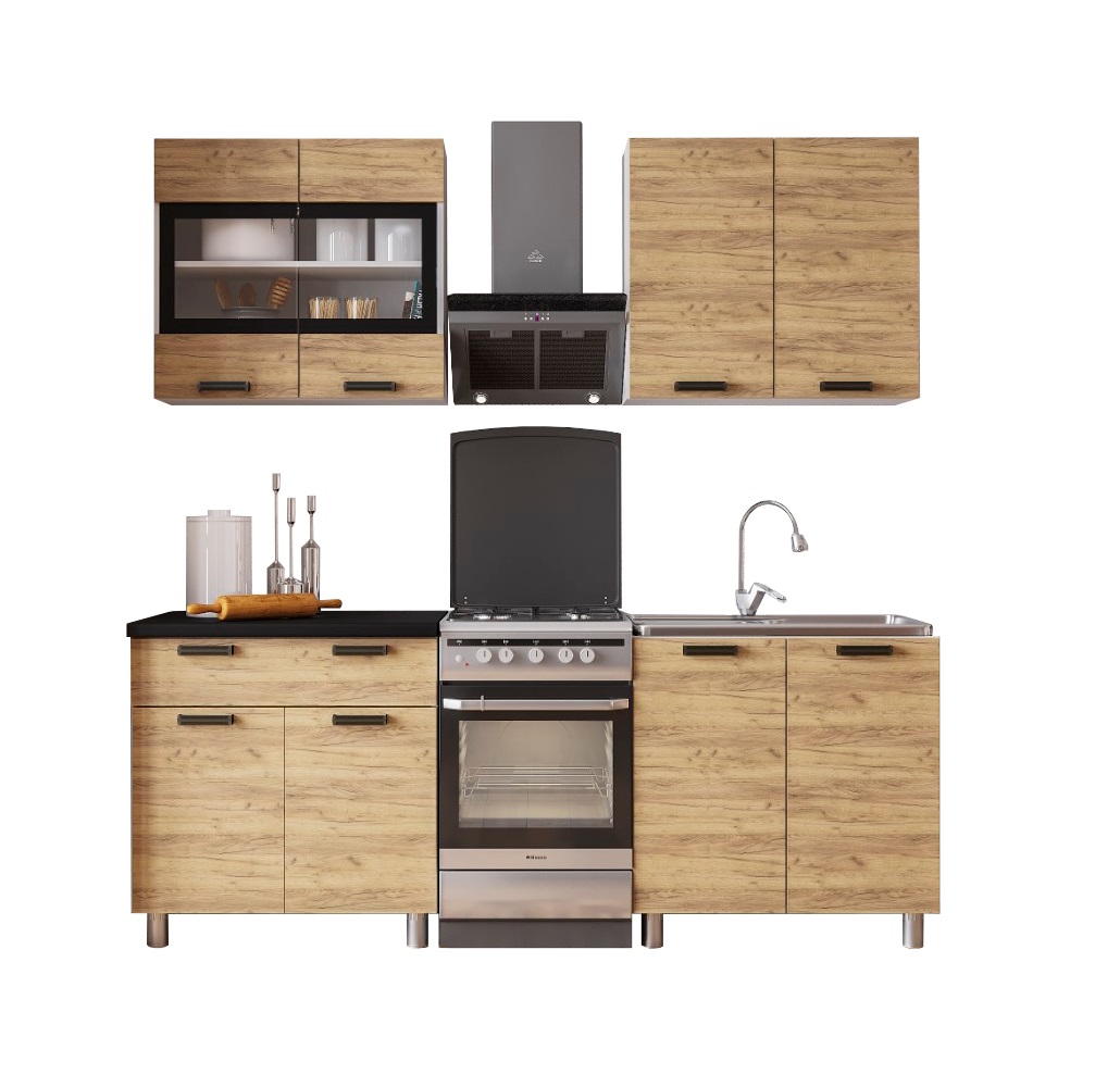 Фактурный древесный декор фасадов кухни Крафт отсылает к природной естественности и грации, а черные элементы создают яркие акценты, привлекающие к себе внимание. Четкие геометрические линии, массивные ручки под металл и фасады под дерево помогают отступить от стандартных шаблонов оформления кухонного пространства, обустроив у Вас дома воплощение изящества и элегантности! Готовое решение Крафт представлено корпусом в белом исполнении. Верхние стеклостворки фасадов украшены прозрачным стеклом в черной декоративной рамке, нанесенной при помощи фотопечати. Кухонный гарнитур Крафт комплектуется столешницей "Черный мрамор" толщиной 38 мм и длиной 800мм. Фурнитура готового решения кухни Крафт изготовлена из самых современных и безопасных материалов. Особенности: - Материал корпуса: ЛДСП - Материал фасада: ЛДСП - Максимальная нагрузка на ящик: 5 кг - Максимальная нагрузка на полку: 10 кг - В комплект входит столешница толщиной 38 мм, длиной 800мм
