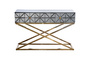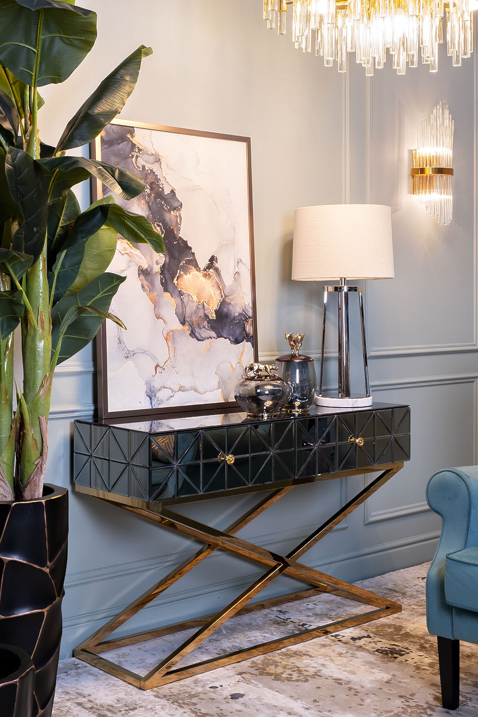 Запросить индивидуальное предложениеДизайнерская зеркальная консоль украсит собой прихожую, коридор или гостиную, эффектно дополнит спальню в качестве туалетного столика. Элегантная, стильная, но в то же время простая и функциональная модель органично вписывается в стилистику ар-деко. Оригинальный каркас из стали с эффектом блестящей позолоты и матовая зеркальная отделка делают консоль с 2мя ящиками эффектным и практичным дополнением к интерьеру. На сайте Garda Decor вы можете купить эту красивую консоль в спальню, гостиную или прихожую в сочетании с другой мебелью.
