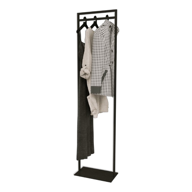 Каркас изготовлен из квадратного профиля размером 2×2 см, что гарантирует устойчивость и надёжность, а матовая порошковая покраска придаёт поверхности элегантный современный вид, защищая металл от коррозии и механических повреждений. Такая вешалка станет универсальным элементом интерьера, гармонично вписываясь в пространство дома, офиса, бутика или студии, сочетая в себе практичность, долговечность и выразительный дизайнерский стиль.