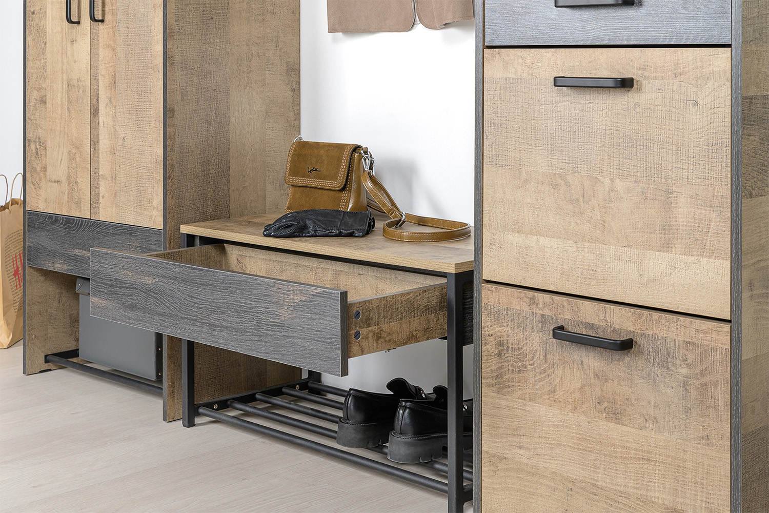 Запросить индивидуальное предложениеОригинальная прихожая в стиле лофт. Скрытые направляющие и четырёхшарнирные петли оснащены доводчиками, что обеспечивают повышенный комфорт и надёжность. Металлические опоры делают эту мебель надёжной, аутентичной и функциональной. Лицевая фурнитура с тем же покрытием придаёт мебели индустриальную эстетику. Съёмная металлическая подставка для обуви значительно упрощает уборку.
