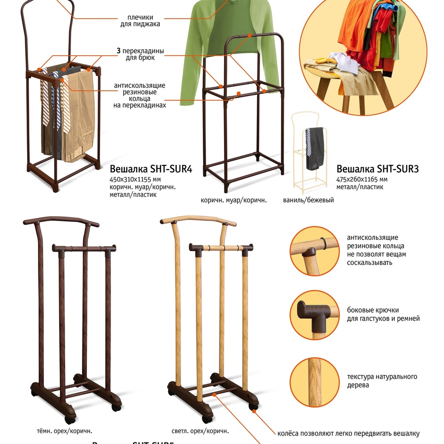 Запросить индивидуальное предложениеПредусмотрены две штанги и две перекладины для брюк и пиджака.