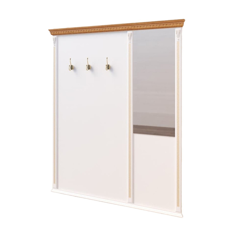 Запросить индивидуальное предложениеПрихожая с зеркалом состоит из функциональных и высококачественных элементов, соответствуют единому стилю прованс, который сочетает в себе простые и лаконичные формы, дух средиземноморья и изящный деревенский колорит.3 крючка из латуни, фрезерованные пилястры, декоративный карниз