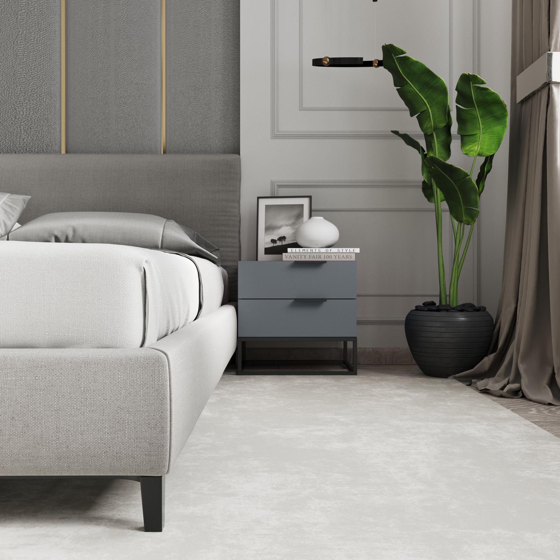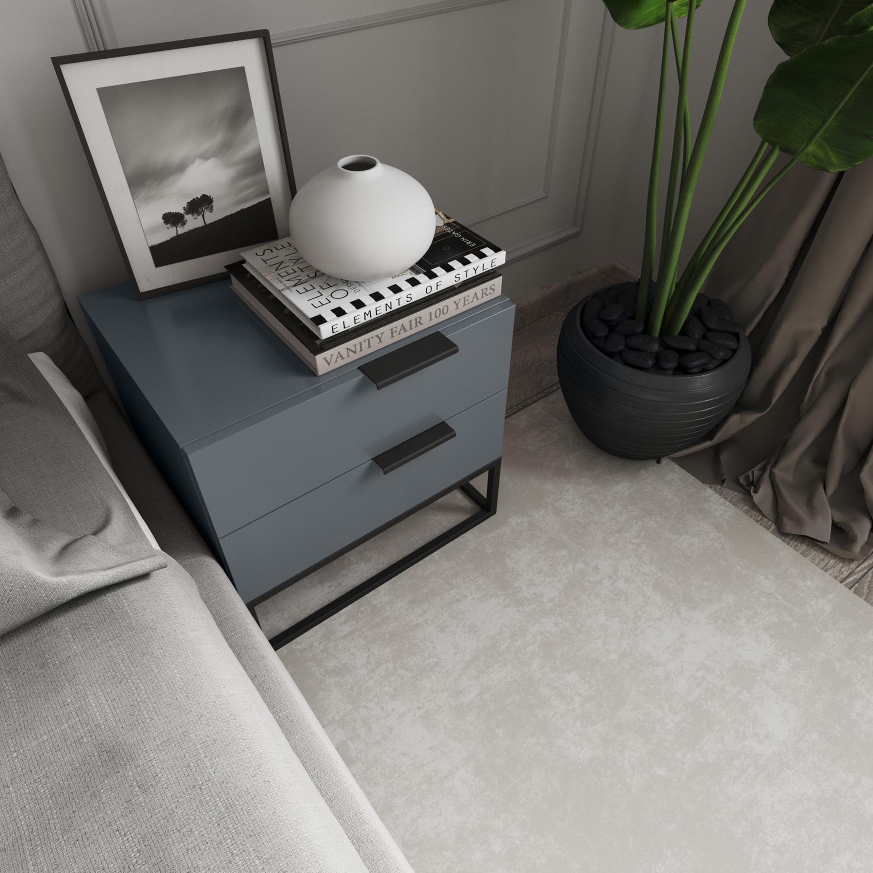 Держите под рукой все необходимое с помощью этой тумбочки современного дизайна. Изготовленная из искусственного дерева с блестящим или матовым лаком, эта тумбочка будет отлично смотреться в вашей спальне независимо от цветовой гаммы. Его металлическая основа с черной отделкой имеет открытый прямоугольный дизайн, придающий силуэту четкую линию. Два выдвижных ящика дают вам различные варианты хранения чего угодно. Тонкие металлические ручки на верхней правой стороне выдвижных ящиков придают им стильный асимметричный вид. Сборка проста – все, что вам нужно сделать, это прикрепить основание.
