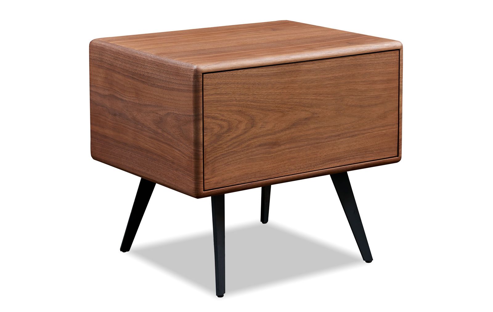Запросить индивидуальное предложениеПрикроватная тумба Elinor (Элинор) на тонких черных ножках выглядит очень изящно и эффектно и прекрасно подходит для многих стилей интерьера. Благодаря компактным размерам и продуманному дизайну она будет хорошо смотреться в спальне любого размера. У данной модели отсутствуют острые углы, что очень удобно – нет риска сильно удариться. Корпус тумбочки приятного орехового оттенка выполнен из шпонированного МДФ, ножки – металлические. На столешнице можно разместить телефон, книгу, очки, часы, небольшую лампу, а в выдвижном, достаточно вместительном ящике – различные вещи, которые хочется спрятать от посторонних глаз и в то же время держать под рукой.