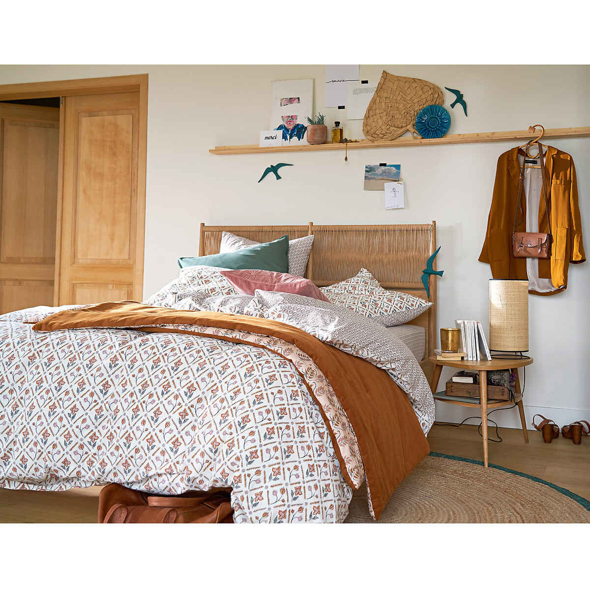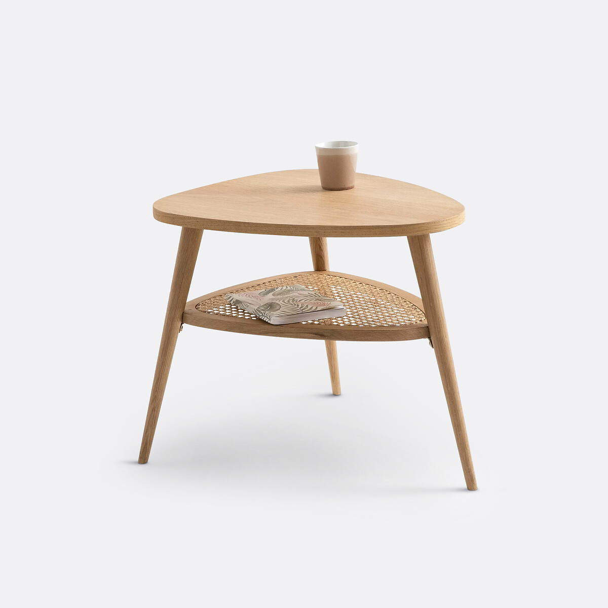 Столик прикроватный из дуба и плетеного ротанга с двойной столешницей Buisseau бежевый