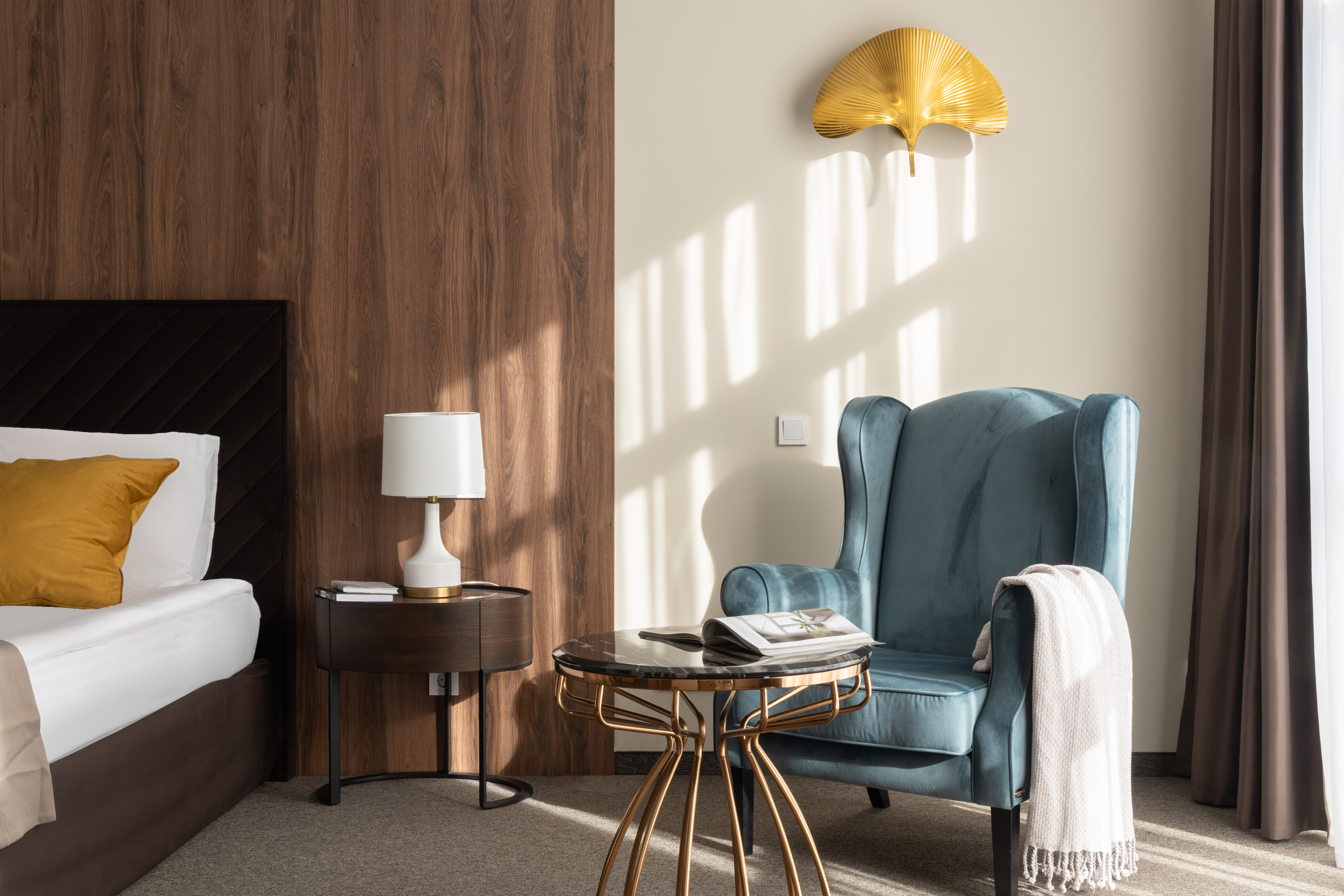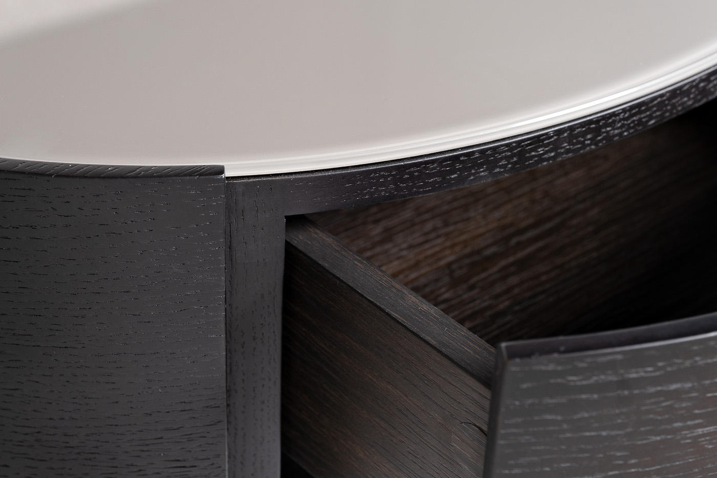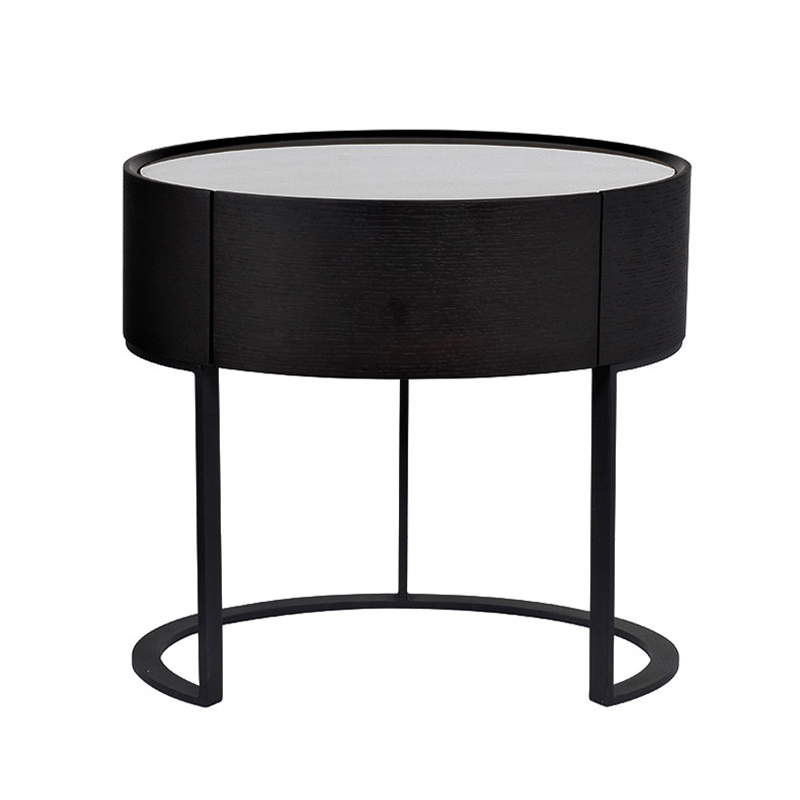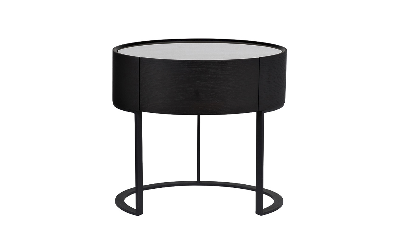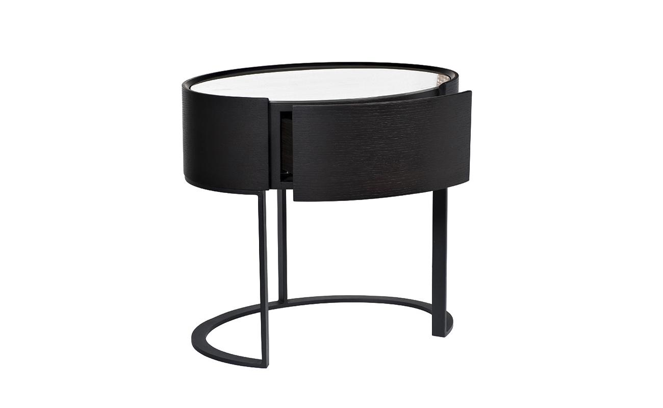 Запросить индивидуальное предложениеДизайнерская тумбочка — классическое решение для хранения личных вещей в спальне и оригинальное дополнение современного интерьера. Изделие сочетает в себе изысканный дизайн, небольшие размеры и функциональность. Модель оснащена ящиком с надежным выдвижным механизмом, который можно использовать для хранения мелочей. Верх тумбочки имеет небольшой бортик, который предотвращает падение и соскальзывание личных вещей. Корпус тумбочки изготовлен из качественного МДФ темного цвета в сочетании с матовым белым стеклом столешницы. Основание тумбы выполнено в форме металлической дуги, что симметрично откликается с овальной формой столешницы. Такая форма делает изделие более изящным и оригинальным.