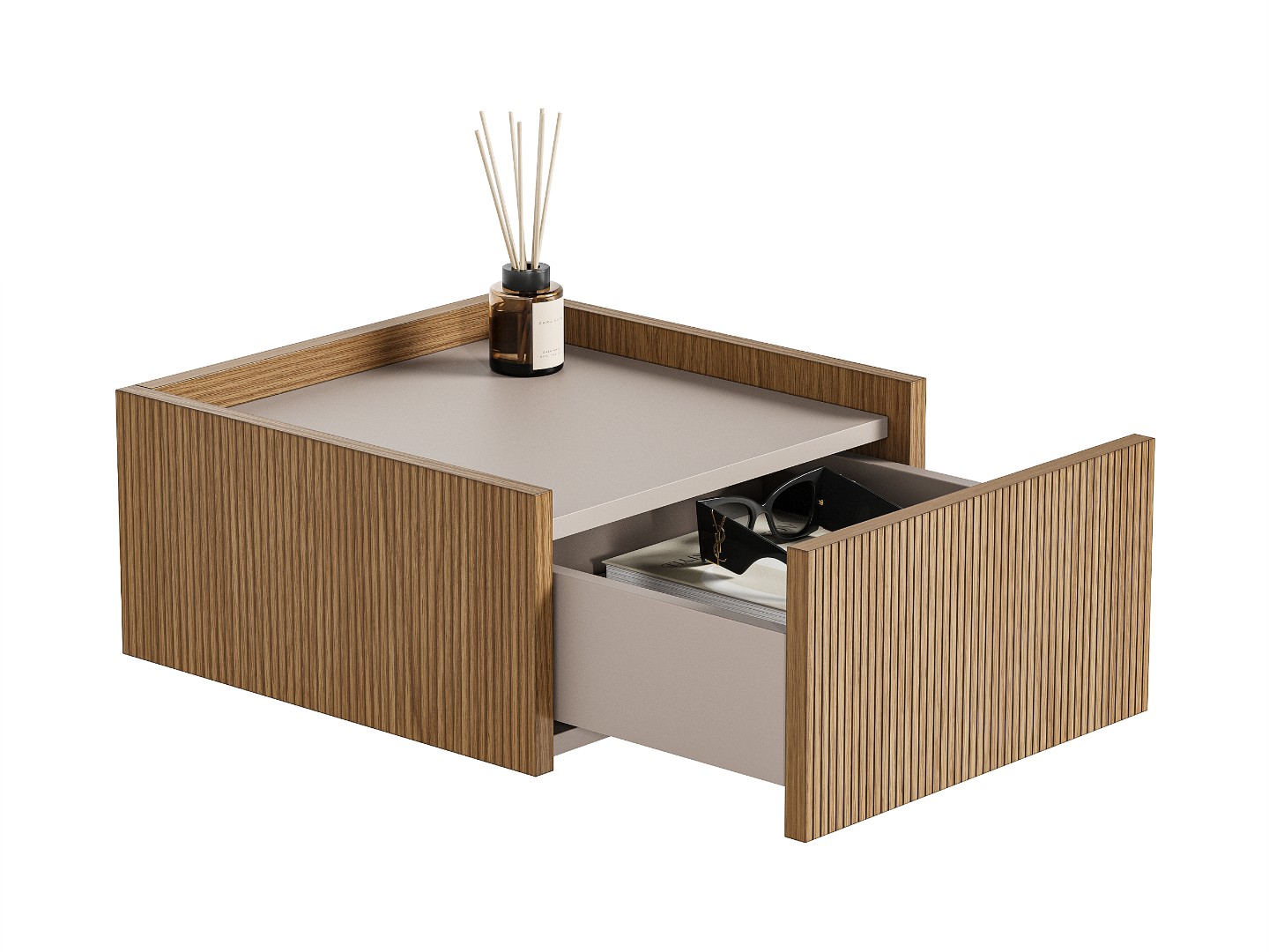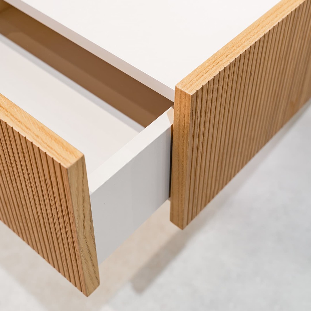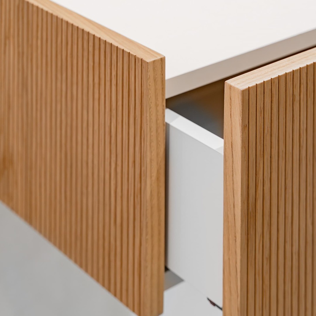 Вертикальная фрезеровка на фасадах и боковинах добавляет тумбе визуального объема и делает ее украшением любого интерьера.