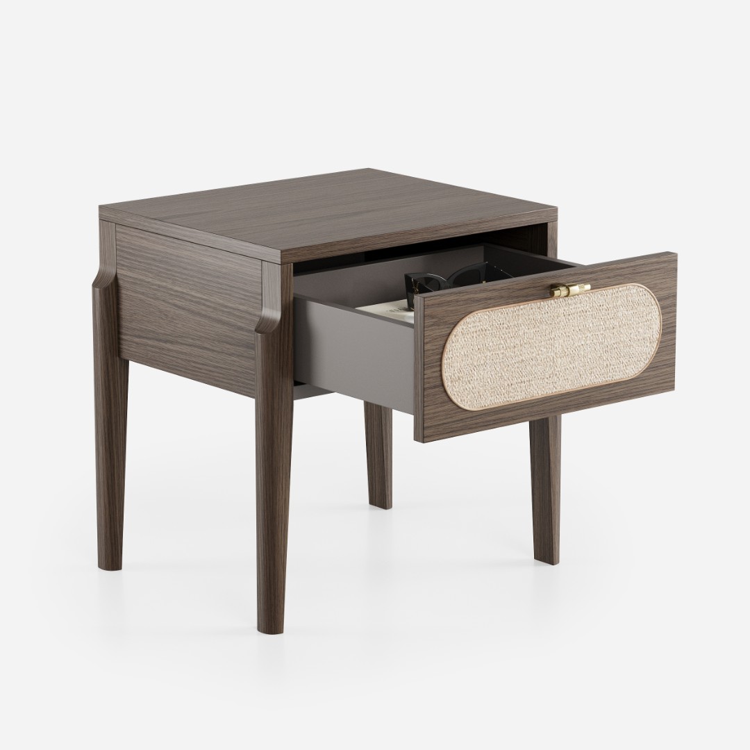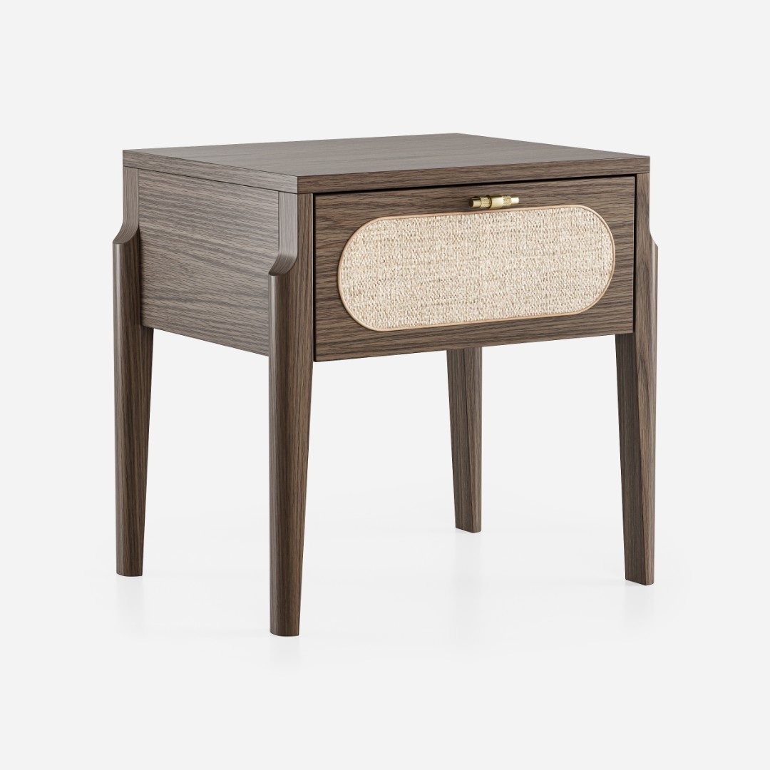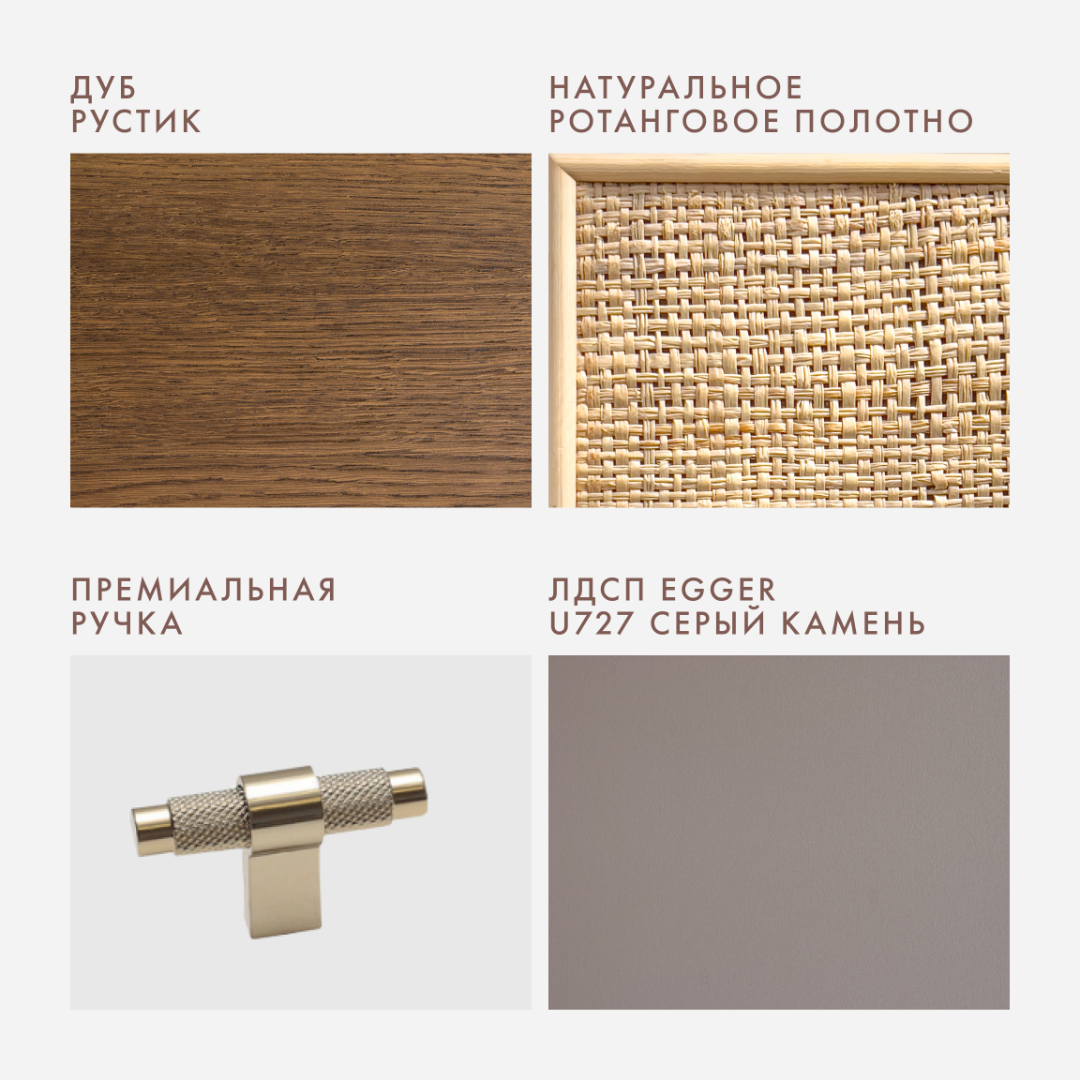 В основе дизайна коллекции Vishera – оригинальный фасадный декор, выполненный из натурального ротангового полотна. Естественная плетеная фактура ротанга придает мебели легкое очарование, свойственное традиционным ремесленным техникам, а природные текстуры и натуральные оттенки отделки создают неповторимую гармонию, теплоту и уют.