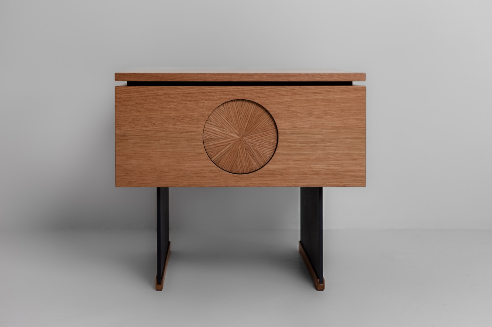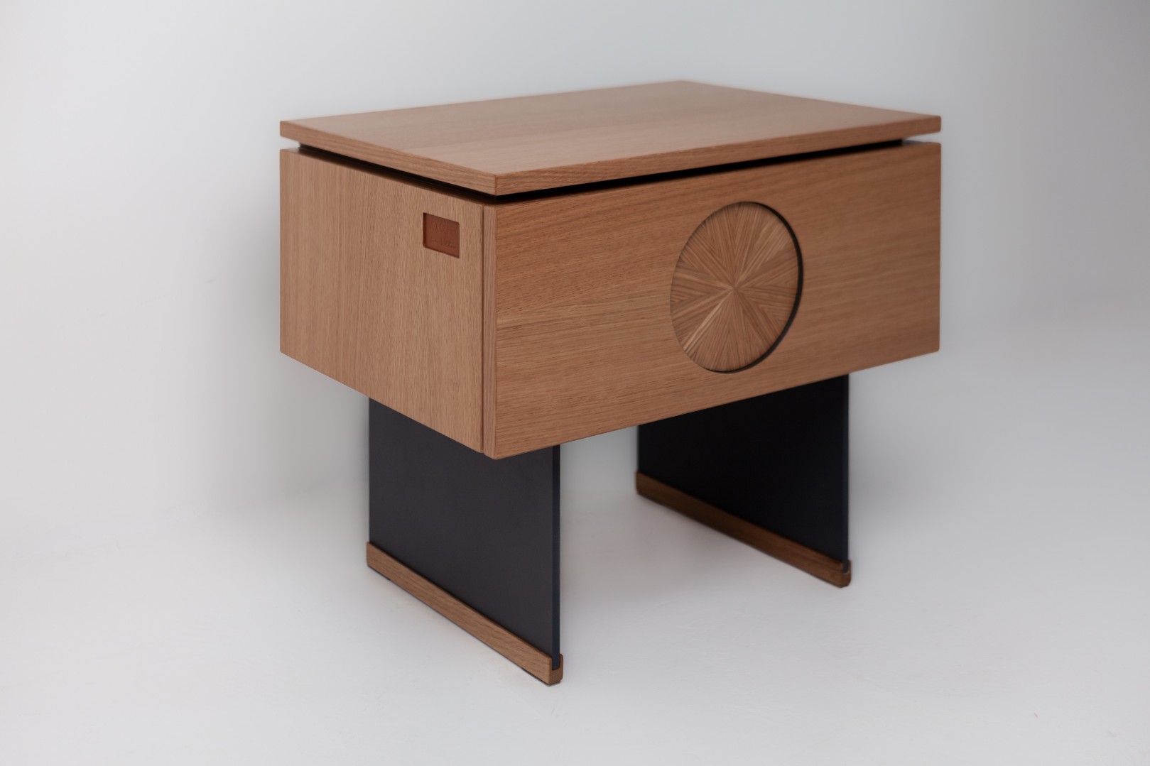Запросить индивидуальное предложениеЭти прикроватные тумбочки создавались в одной серии с комодом Sheen Sideboard, чтобы получился идеальный комплект мебели в спальню В серии предметов Sheen использованы ножки из металла, что позволило сделать их очень утонченными Главным декоративным элементом стал слегка притопленный круг с набранным к центру шпоном Тонировка шпона — +10% к стоимости.