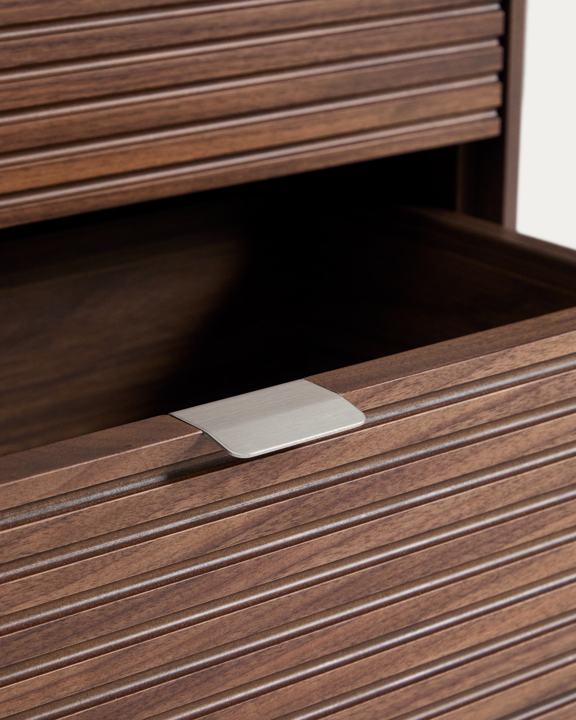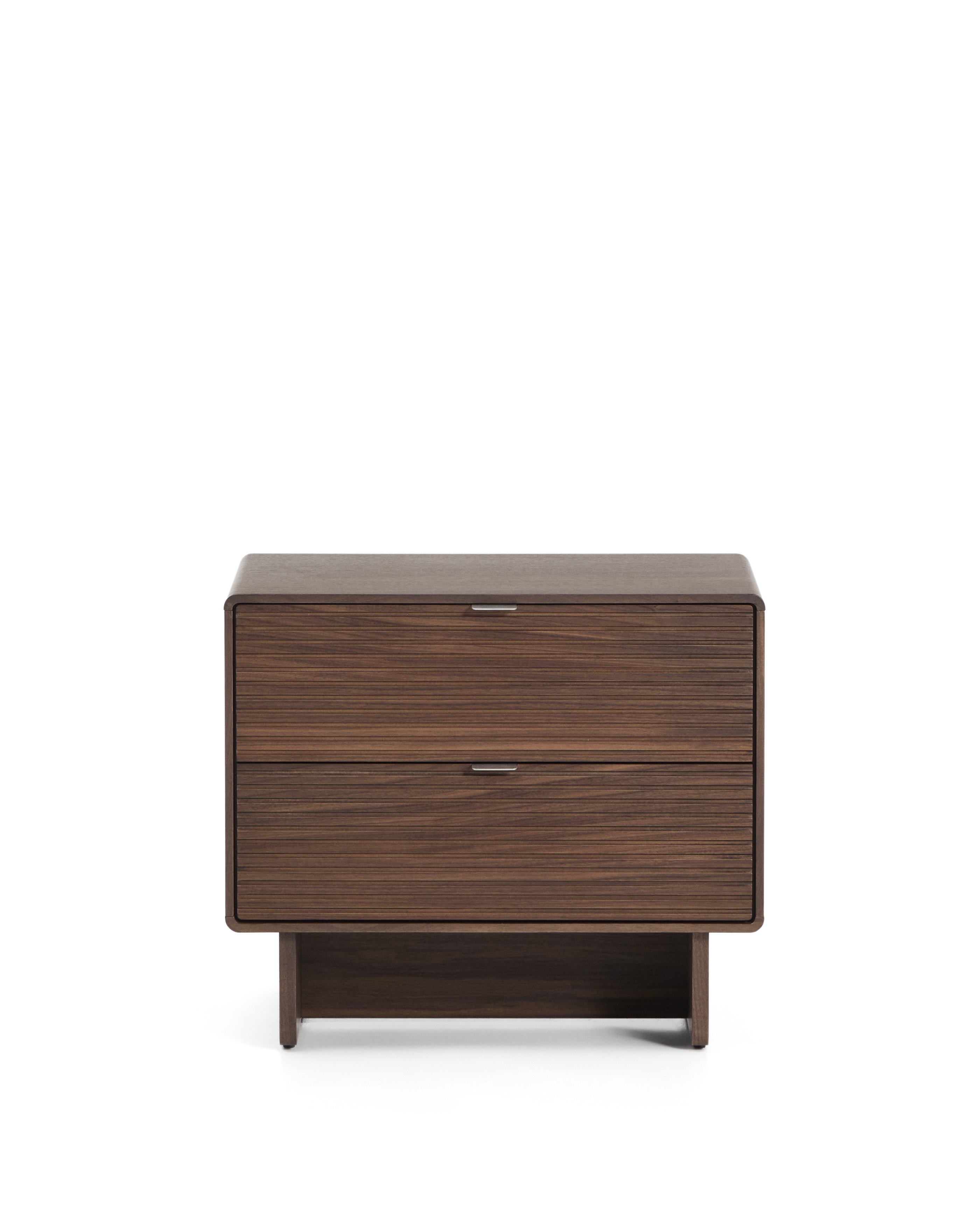 Тумбочка каркасная. Ее внутреннее наполнение включает два выдвижных одинаковых ящика. Их размер: 58х18х20см. Ящики дополнены мягкой системой открытия и металлическими ручками. Фасады имеют реечную фактуру.