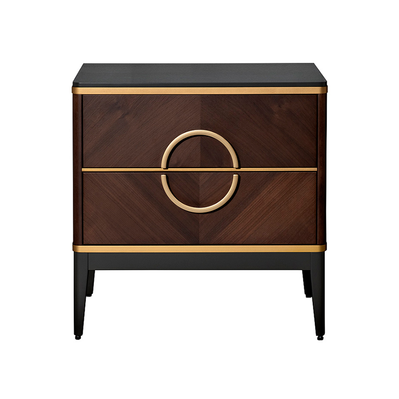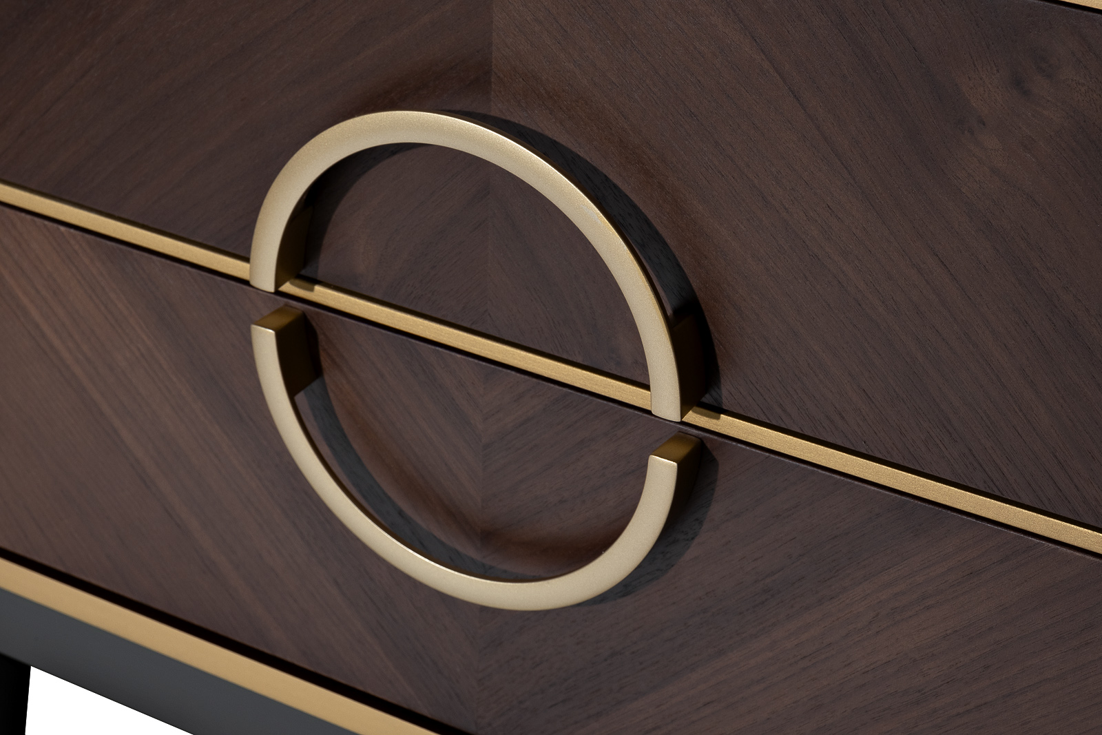 Запросить индивидуальное предложениеПрикроватная тумбочка в отделке тёмным шпоном привносит в интерьер спальни ощущение выверенной элегантности и статусной сдержанности. Геометрия фасадов с выразительным рисунком древесины подчеркнута тонким кантом, а фирменная кольцевая ручка добавляет образу характер modern luxury. Лёгкие опоры приподнимают корпус, создавая визуальную лёгкость при сохранении ощущения надёжности. Практичная прикроватная тумбочка с двумя выдвижными ящиками позволяет аккуратно разместить всё необходимое рядом с кроватью. Тумба прикроватная с 2-я ящиками из коллекции "ШПОН". Коллекция "ШПОН" является авторской разработкой студии Garda Studio, в стиле ар-деко.Габариты тумбы:ширина-60см, глубина-60см, высота-40см. Фасады коллекции "ШПОН" облицованы шпоном под цвет "Американский орех", украшены объемными полукруглыми ручками цвета "матовое золото"(ручки-металл) и декоративными элементами из массива бука под цвет "матовое золото". В состав коллекции так же входит: тумба под TV-арт.151SV-10003; консоль-арт.151SV-10002