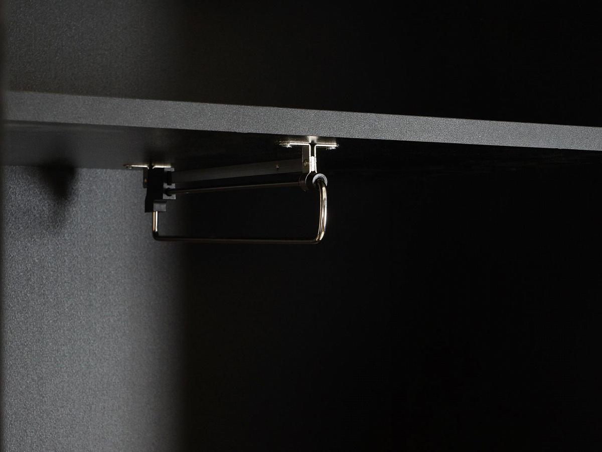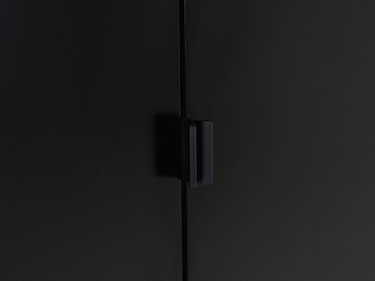 Запросить индивидуальное предложениеЗа двумя распашными дверями слева расположено отделение с выдвижной штангой для хранения одежды на плечиках и с полкой для головных уборов. Справа находится отделение с четырьмя полками. Полки съёмные, по высоте не переставляются. Крышка и нижний щит шкафа изготовлены из МДФ т. 16мм и окрашены в черный цвет полиуретановой эмалью.