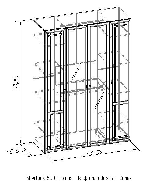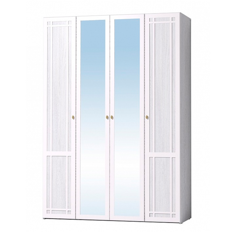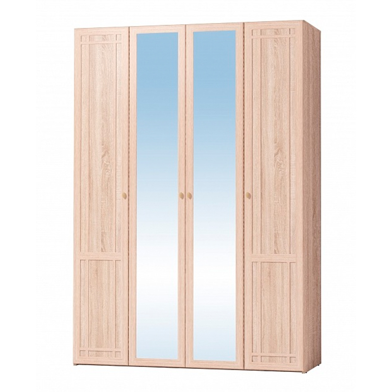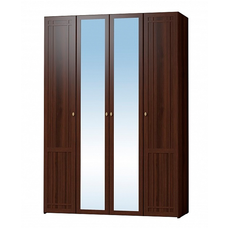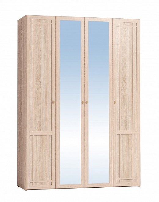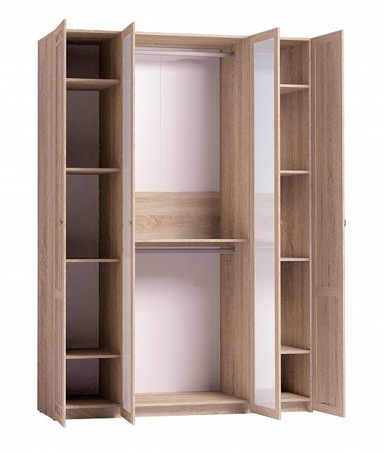 Запросить индивидуальное предложениеОрганизовать продуманное хранение вещей в спальне или гостиной поможет вместительный четырехдверный шкаф с разноплановым наполнением. По бокам шкаф комплектуется четырьмя полками, регулируемыми по высоте. В центральной части расположены две стационарные штанги, высоту которых также можно менять благодаря трем вариантам присадки. Глухие фасады модуля декорированы раскладкой, зеркальные — нет. Зеркальная часть визуально облегчает конструкцию шкафа и освежает интерьер. Данная модель — практичное решение, которое по функционалу и вместимости является прекрасной альтернативой шкафу-купе.