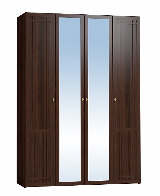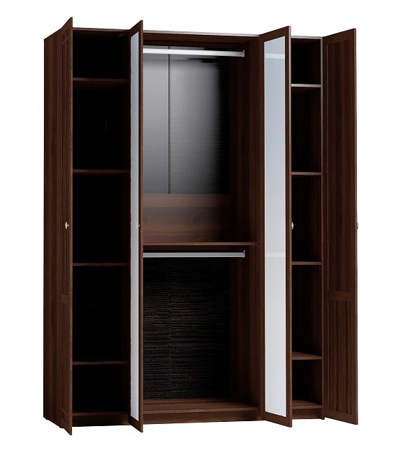 Запросить индивидуальное предложениеОрганизовать продуманное хранение вещей в спальне или гостиной поможет вместительный четырехдверный шкаф с разноплановым наполнением. По бокам шкаф комплектуется четырьмя полками, регулируемыми по высоте. В центральной части расположены две стационарные штанги, высоту которых также можно менять благодаря трем вариантам присадки. Глухие фасады модуля декорированы раскладкой, зеркальные — нет. Зеркальная часть визуально облегчает конструкцию шкафа и освежает интерьер. Данная модель — практичное решение, которое по функционалу и вместимости является прекрасной альтернативой шкафу-купе.