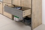 Благодаря скрытым направляющим и четырёхшарнирным петлям с доводчиками обеспечивается максимальный комфорт и надёжность использования. Металлические опоры придают мебели прочность, аутентичность и функциональность. Лицевая фурнитура с таким же покрытием подчёркивает индустриальный стиль.