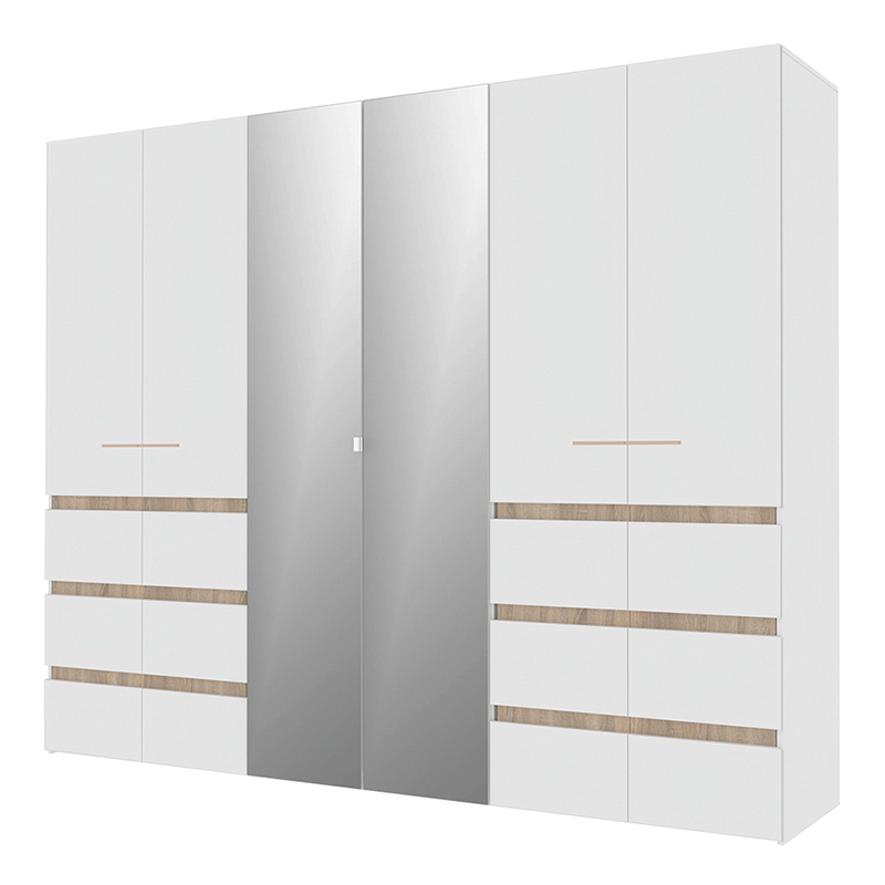 За распашными фасадами вы найдете два отсека с хромированными штангами для одежды и антресолью и секцию с полками для белья.