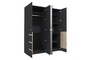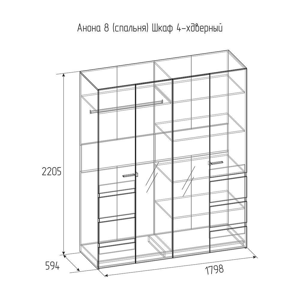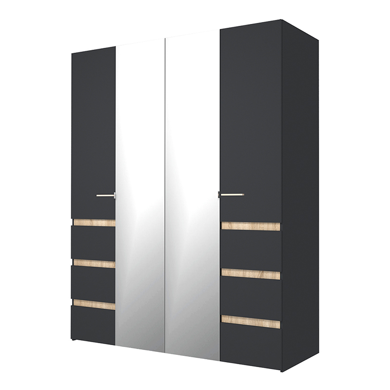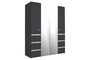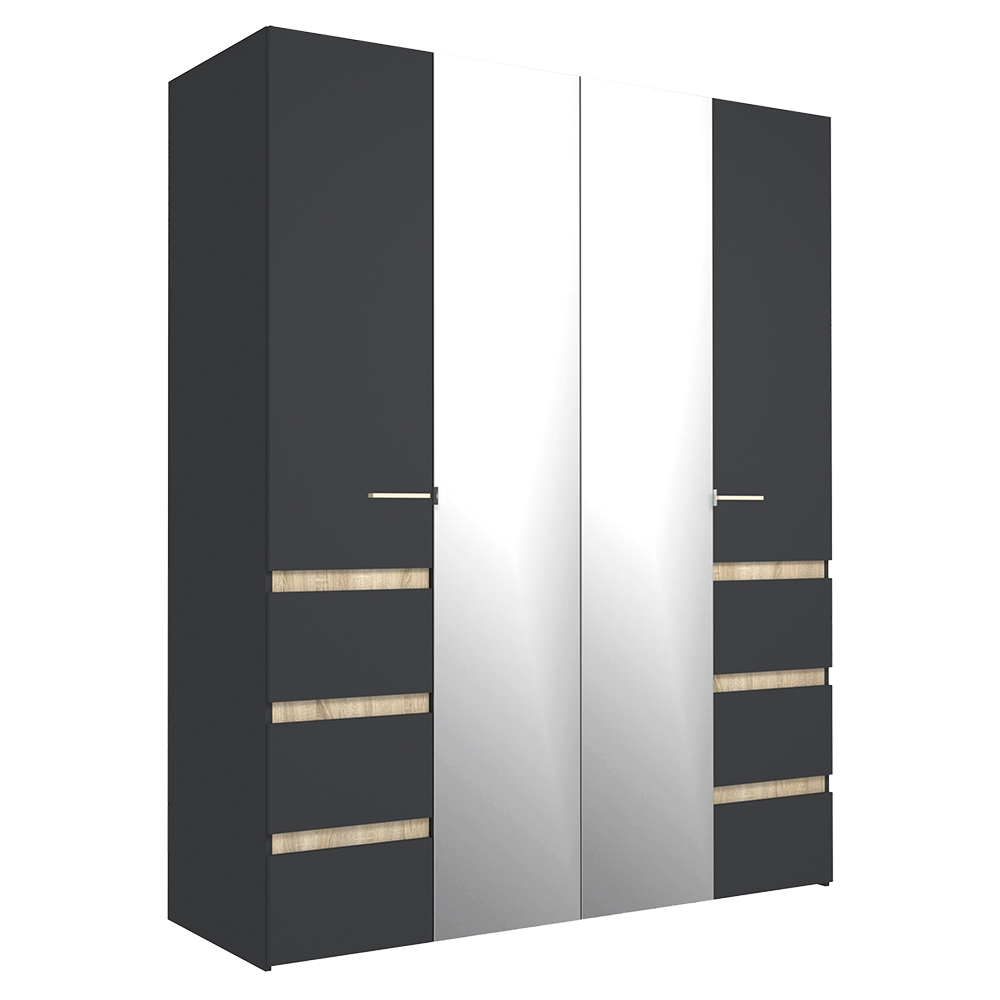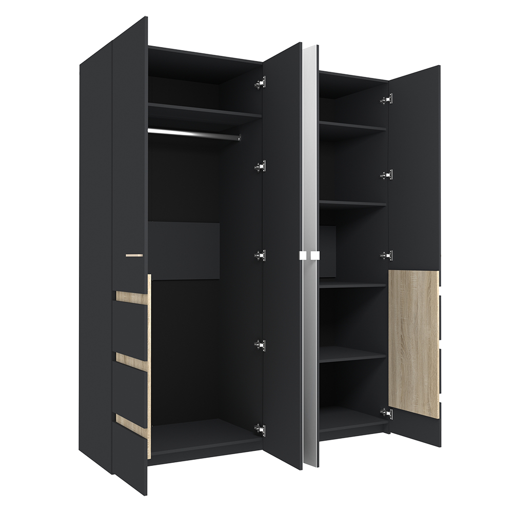 Запросить индивидуальное предложениеШкаф распашной четырёхдневный с декоративными вставками дуб сонома. Особенно эффектно смотрится двери с зеркалами в сочетании с цветом антрацит. За фасадами вы найдете отсек с хромированной штангой и антресолью и секцию с полками.
