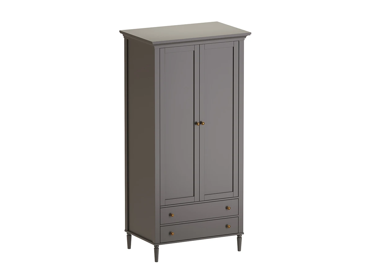 Шкаф Blues с двумя распашным дверями и двумя выдвижными ящиками. В отделении за дверями располагается продольная штанга для хранения одежды на плечиках, над штангой полка. Выдвижные ящики расположены в нижней части шкафа. Фасады из МДФ толщиной 16 мм. Корпуса ящиков изготовлены из ЛДСтП толщиной 16 мм.