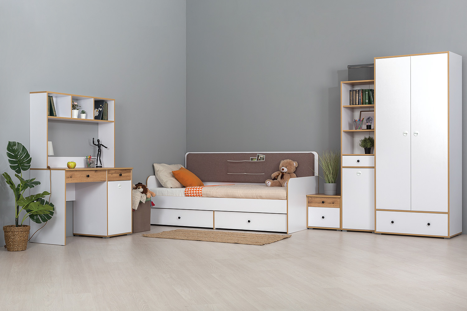 Корпус и фасады шкафа изготовлены из экологически чистой ламинированной ДСП толщиной 16 мм, а торцы окромлены ПВХ-плёнкой толщиной 0,4 мм. Лицевая фурнитура выполнена из чёрного пластика, а при отсутствии лицевой фурнитуры фасады открываются за вырез по центру. Распашные двери модулей молодёжной Вуди установлены на четырёхшарнирных петлях без доводчиков. Выдвижной ящик на шариковых направляющих обеспечивает тихую и долговечную работу.