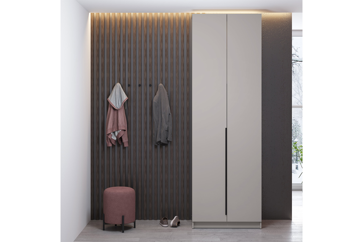 За распашными дверями расположено одно отделение со штангой и несколько полок. Две удобные ниши в нижней части шкафа подойдут для обуви, коробок или органайзеров. В верхней части шкафа расположены три ниши – для хранения одежды, аксессуаров или головных уборов.