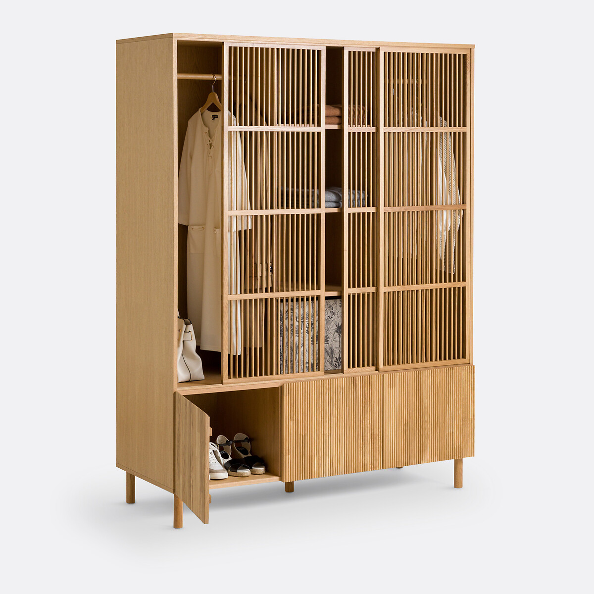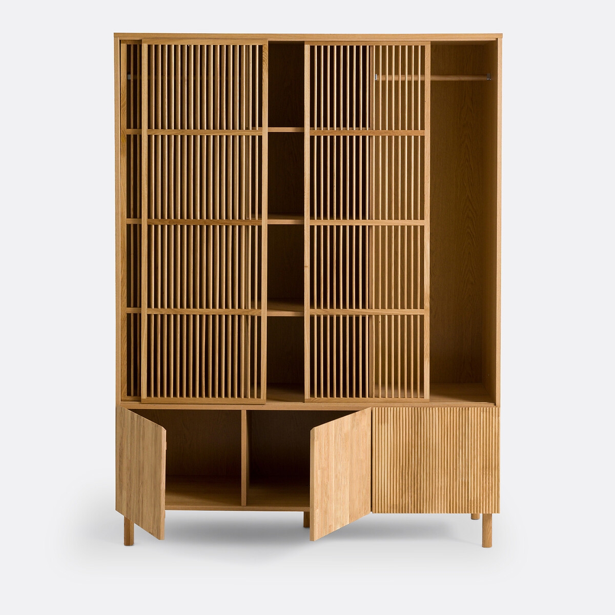 • 1 перекладина для вешалок с каждой стороны + 3 полки по центру с 4 нишами