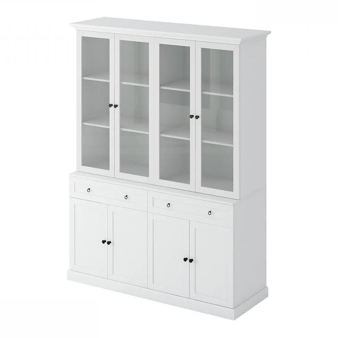 Изделие состоит из витрины, установленной на тумбу с ящиком и дверями. Верх представляет собой два отделения, каждое за двумя стеклянными дверями. В каждом отделении по две щитовые полки. Полки съемные, с перестановкой по высоте в 3 положения. Витрина Caprio предназначена ТОЛЬКО для установки на тумбу Caprio. Имеет крепления к стене только для защиты от опрокидывания. Отдельная навеска на стену не предусмотрена. Тумба состоит из двух отделений под общей крышкой. В каждом отделении ящик и две двери. За дверями съемная полка.