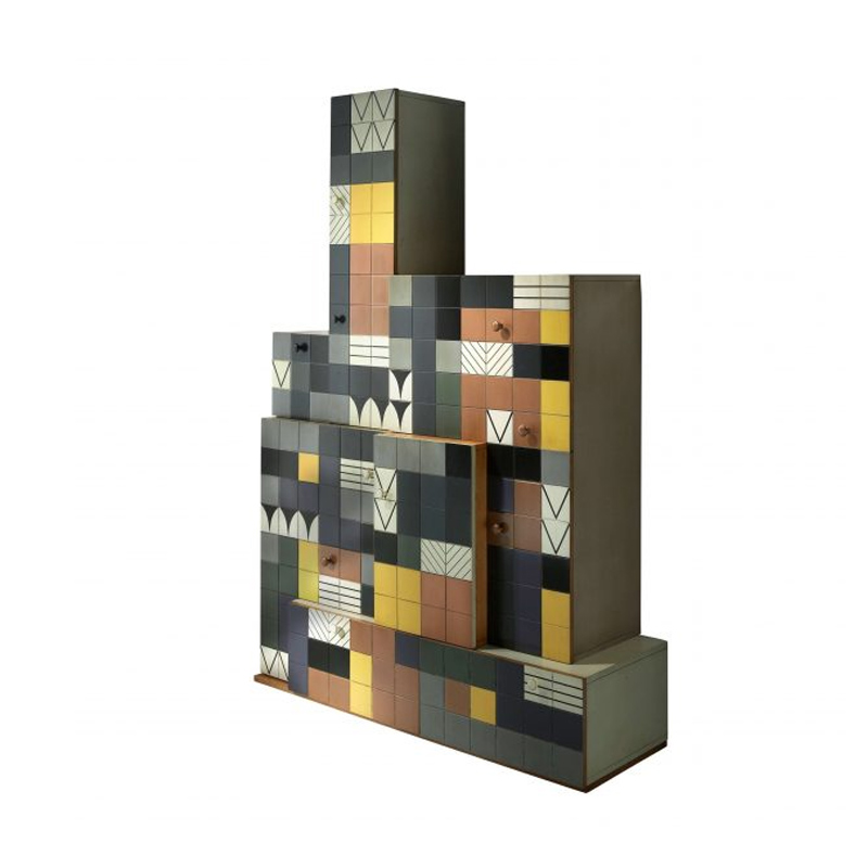 Образная композиция из квадратных фрагментов разных цветов и рисунков. Идея возникла из таких головоломок, как танграм, где из нескольких геометрических фигур складываются самые разные фигуры в забавном лабиринте возможностей и абстракций. За шестью дверцами и двумя ящиками скрывается чистый дизайн и функциональность. Бесконечные возможности: выбирайте из разных вариантов отделки и играйте с размерами и особенностями интерьера.