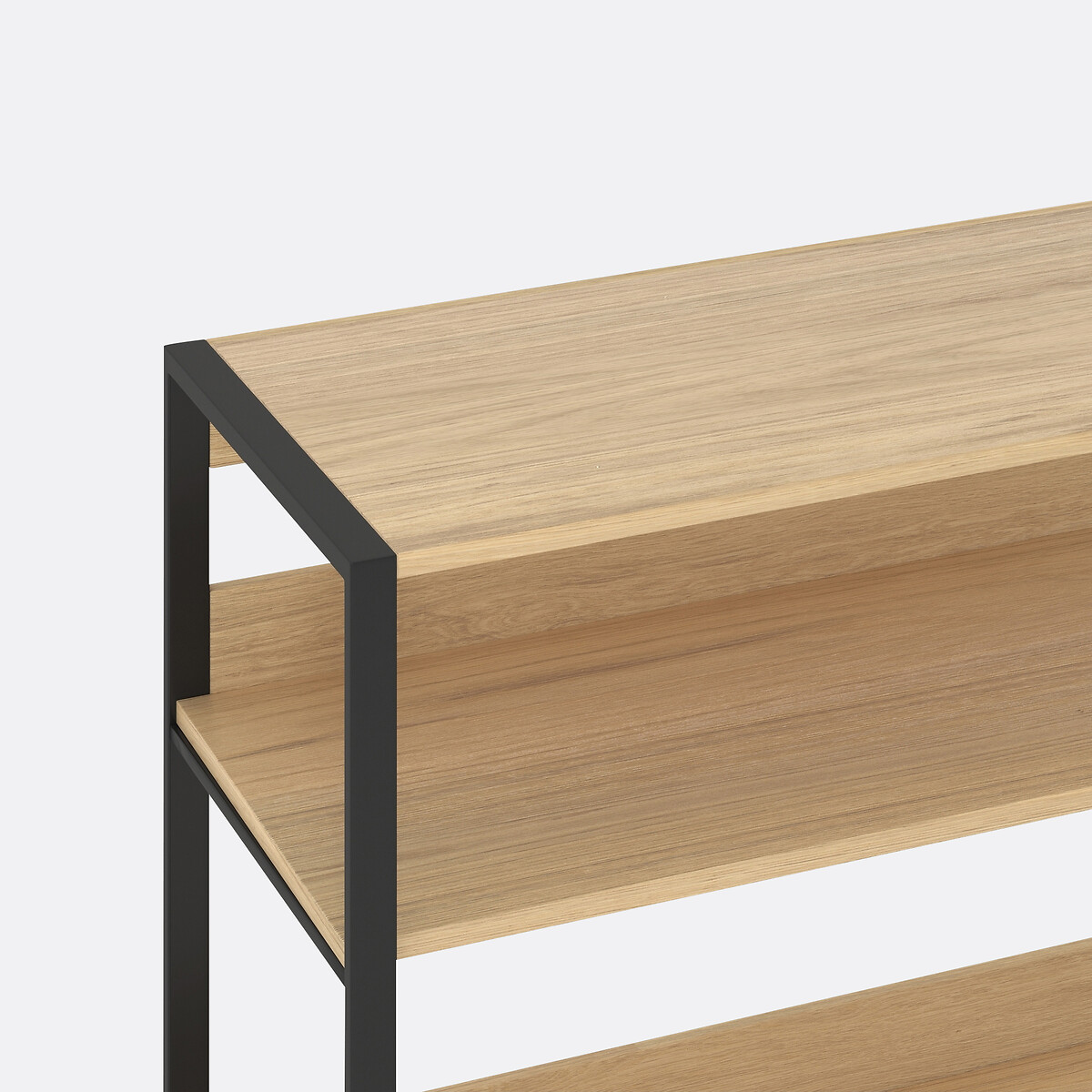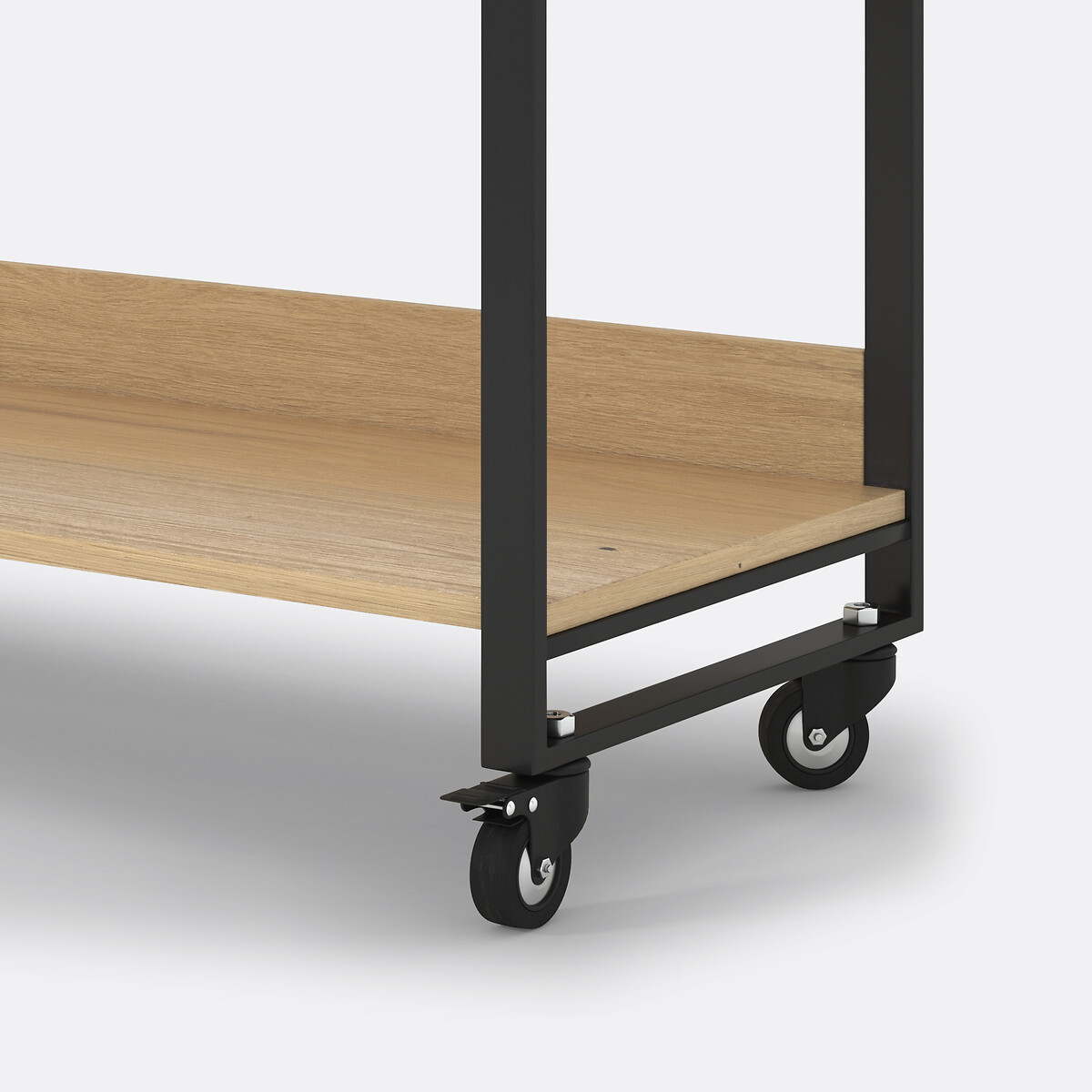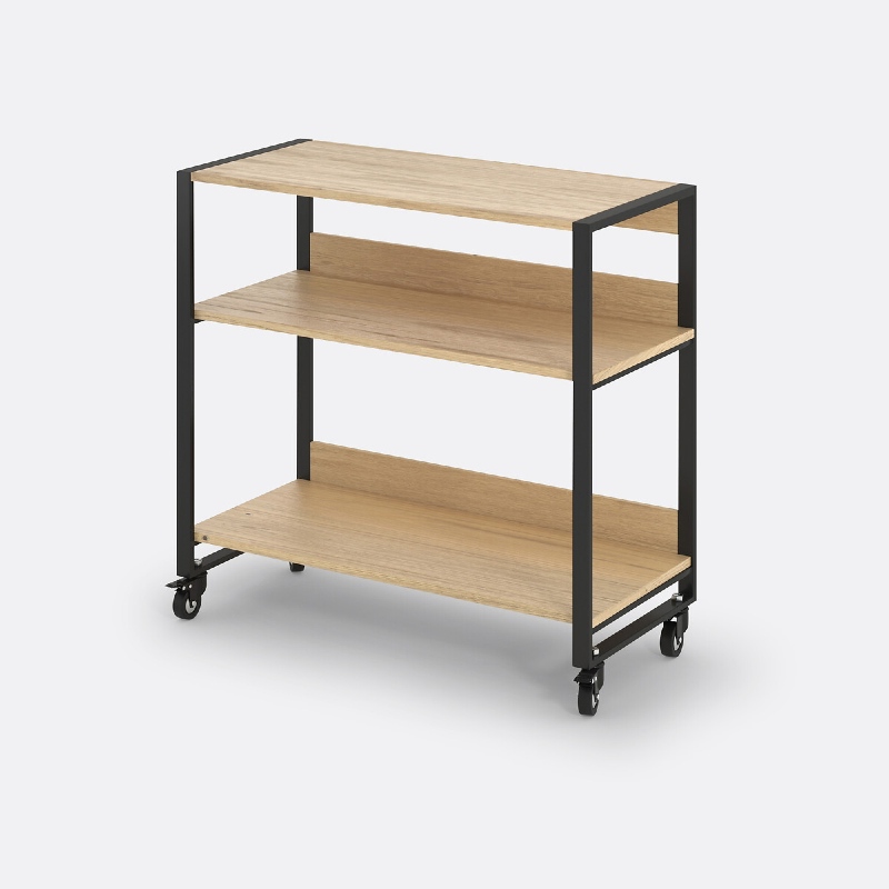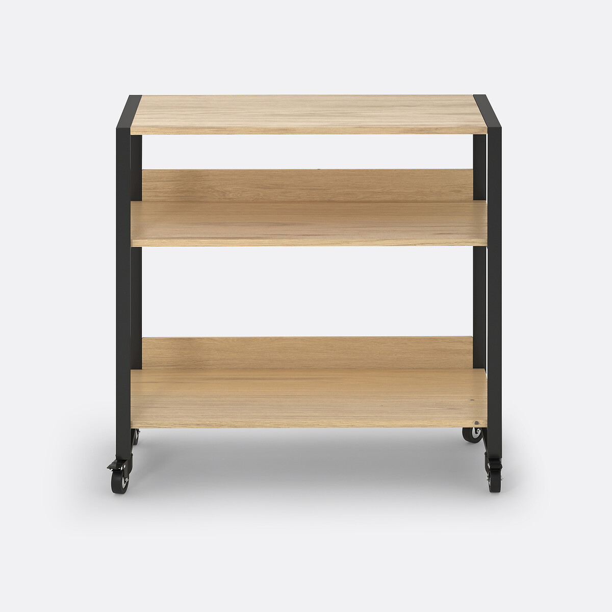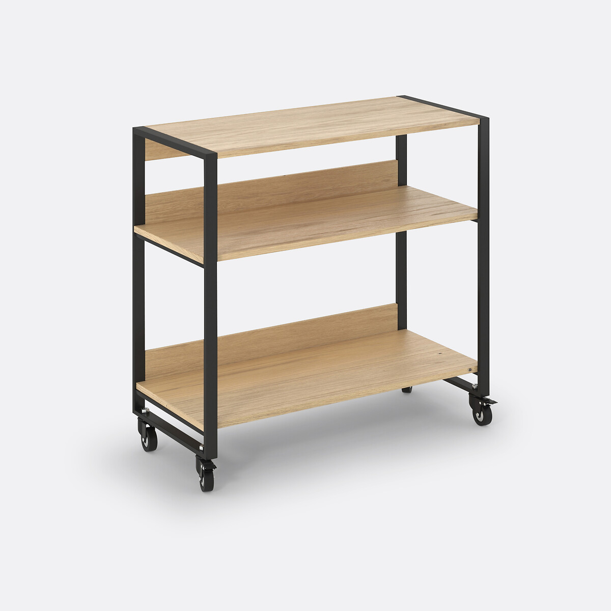 Запросить индивидуальное предложениеЭтажерка на колёсиках, Hiba. Стол можно передвигать, куда Вам нужно, подавать тарелки и пр., или акссесуары и забирать с лёгкостью, благодаря хорошей вместимости, за счёт 3-х полок.Описание • Три полки • Четыре колеса • Чёрный матовый металлический каркас • Полки из стыковой сосновой панели с олифовым покрытием.