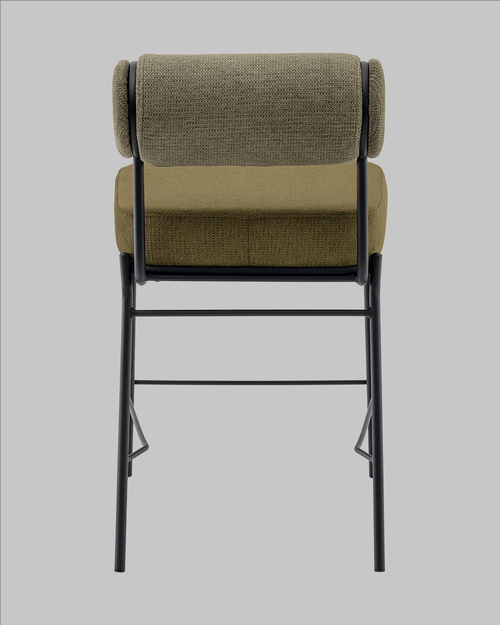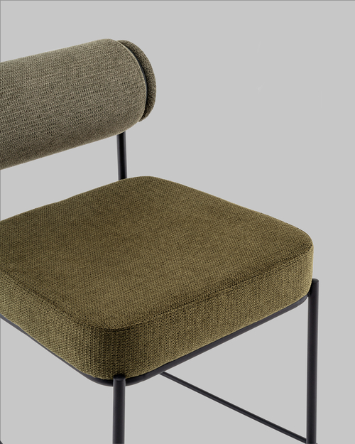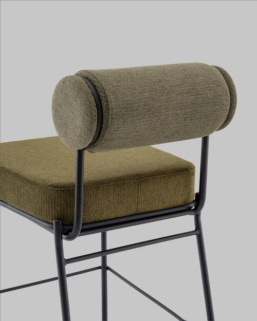 Эта модель привлекает внимание необычной формой спинки — мягкий цилиндрический валик добавляет оригинальности и поддерживает комфорт при посадке. Четкие линии каркаса и тонкие ножки создают легкий, воздушный силуэт, который идеально вписывается в современный интерьер.