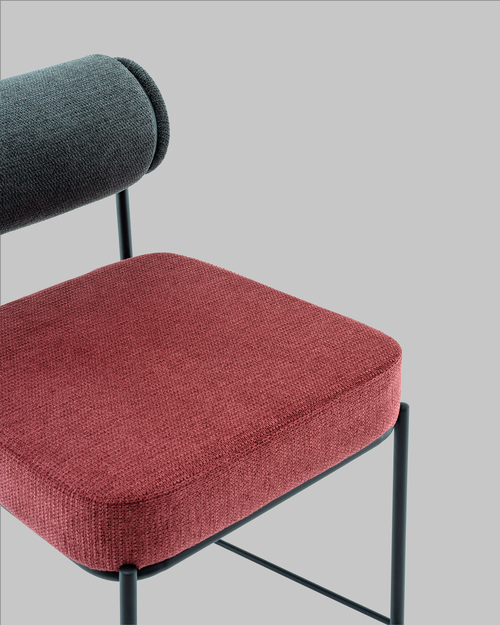 Эта модель привлекает внимание необычной формой спинки — мягкий цилиндрический валик добавляет оригинальности и поддерживает комфорт при посадке. Четкие линии каркаса и тонкие ножки создают легкий, воздушный силуэт, который идеально вписывается в современный интерьер.