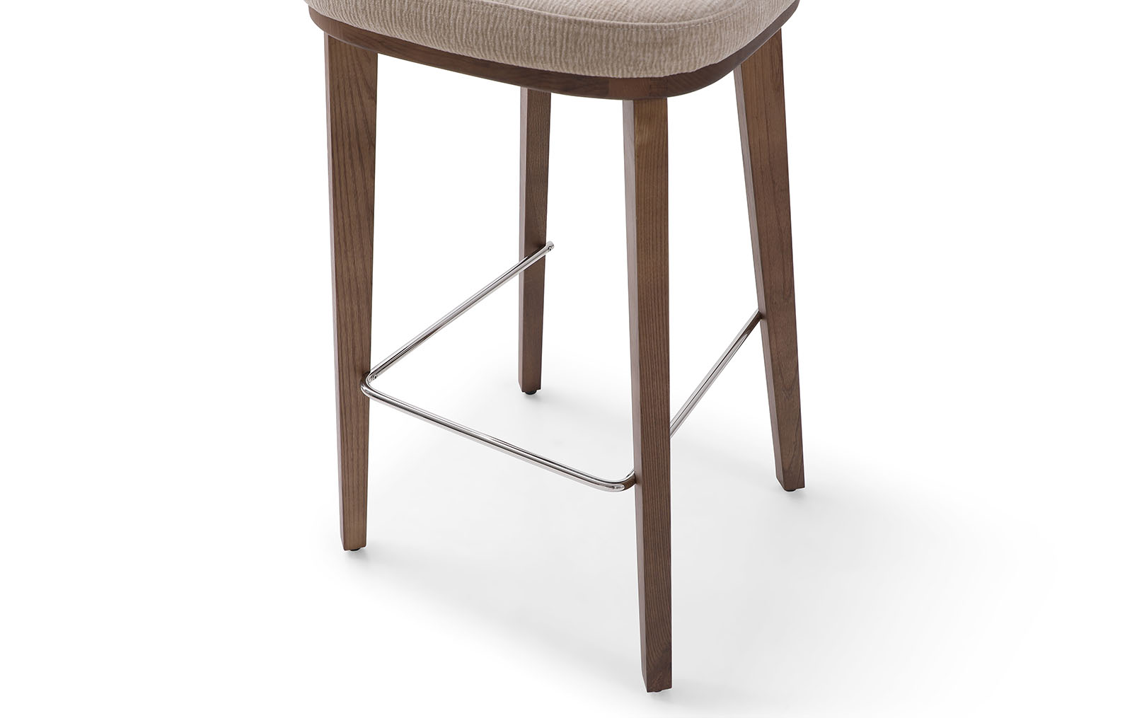 Стул отличается мягким сиденьем и спинкой, надежными ножками из дерева, а также стальной перекладиной внизу, на которую можно поставить ноги для того, чтобы сидеть было еще комфортнее.