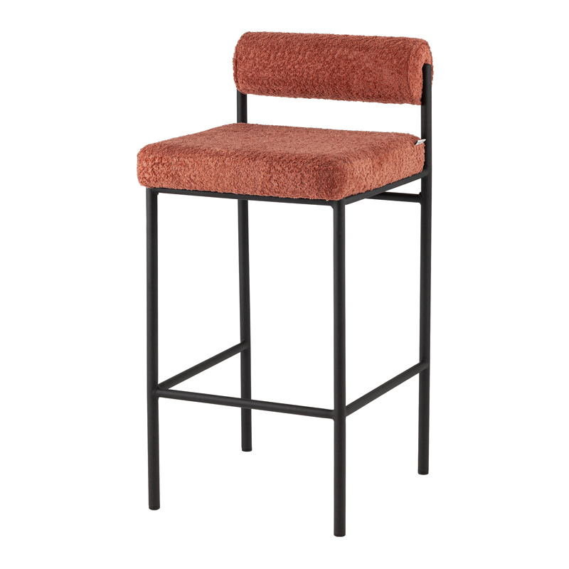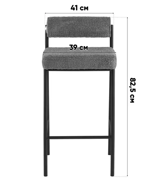 Каркас выполнен из металла, что обеспечивает высокую прочность и устойчивость при эксплуатации. Сиденье и спинка наполнены эластичным ППУ, благодаря чему стул остаётся мягким даже при длительном использовании. Спинка выполнена в виде валика, что создаёт удобную опору для поясницы. Высота сиденья составляет 65,5 см — идеально подходит для полубарных стоек и высоких обеденных столов.